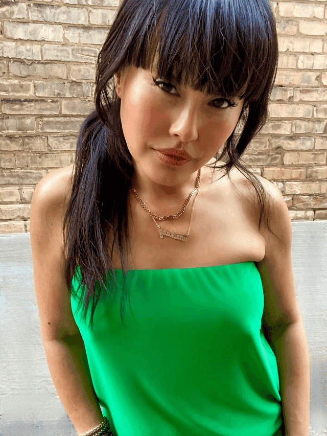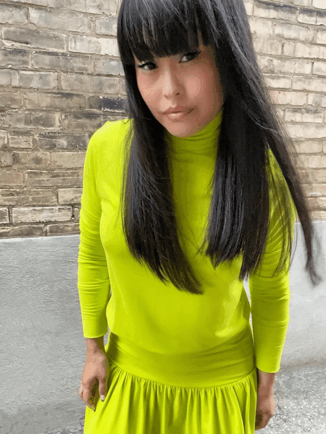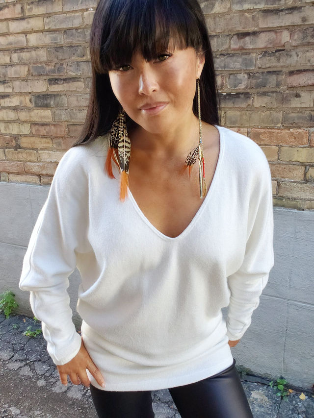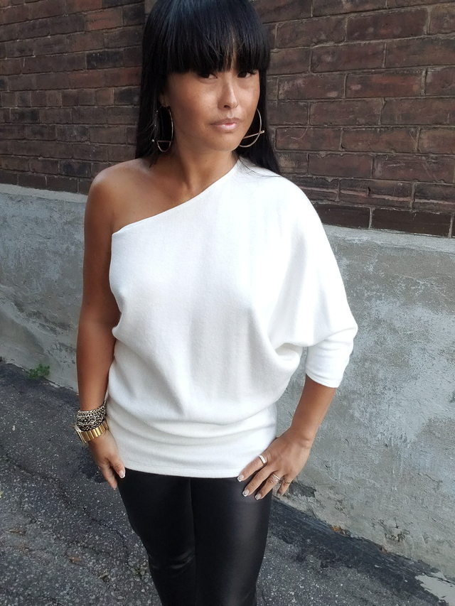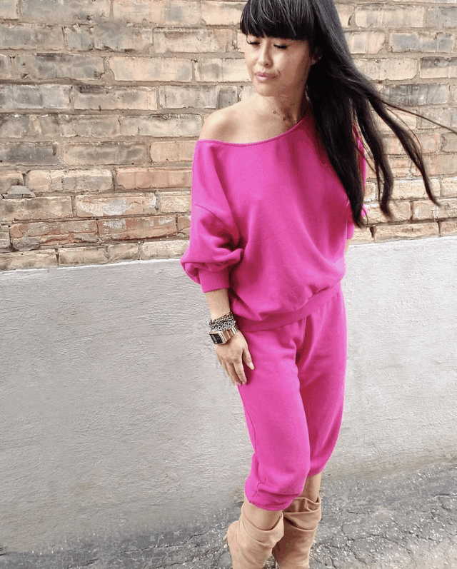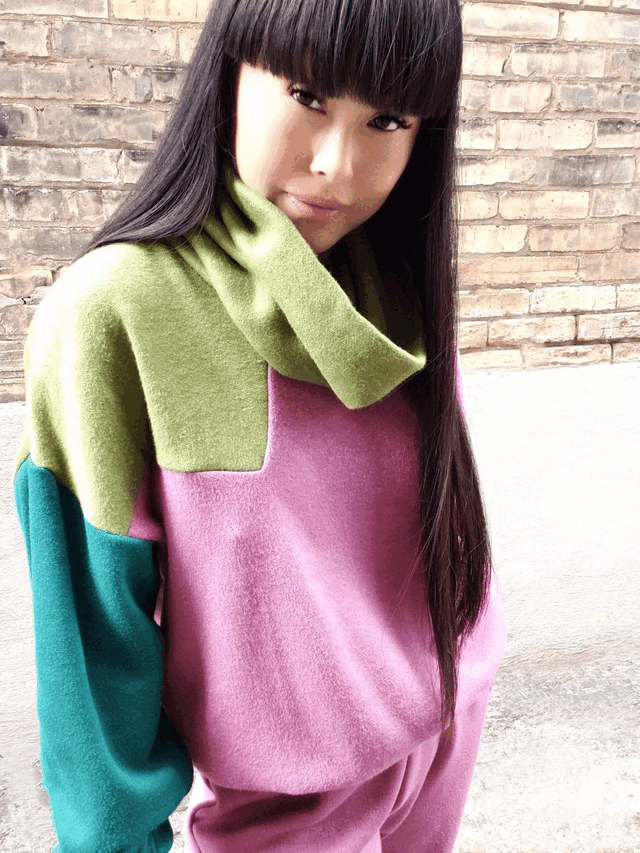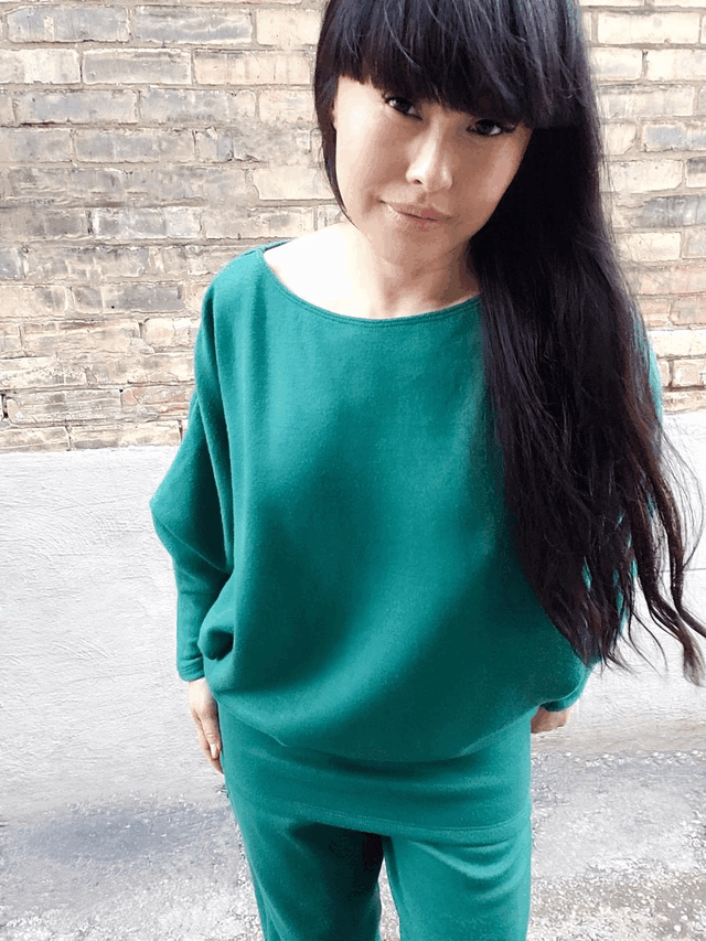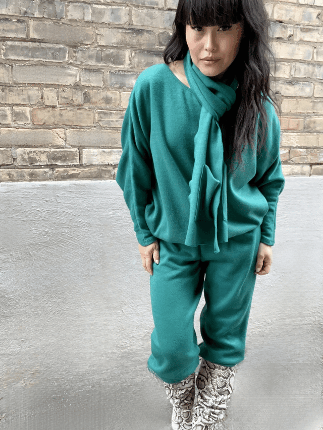 Verdant green ultra soft sweater crafted in a flash dance neckline style, combined with chic loose joggers and the iconic Anne Hung mini pocket scarf.