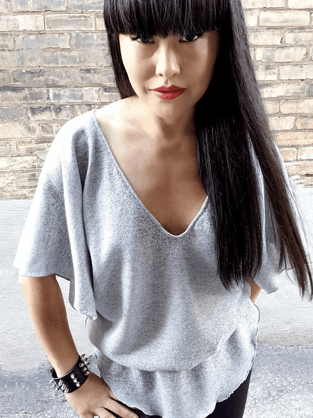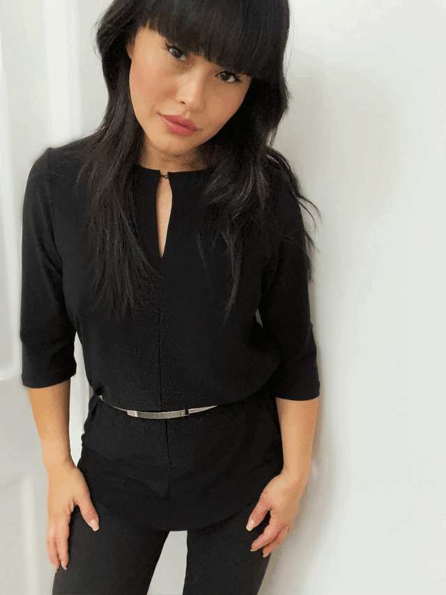 The Anne Hung collection is renowned for its elegant basics, like this 3/4 sleeve jersey top with a keyhole front and sporty hem.