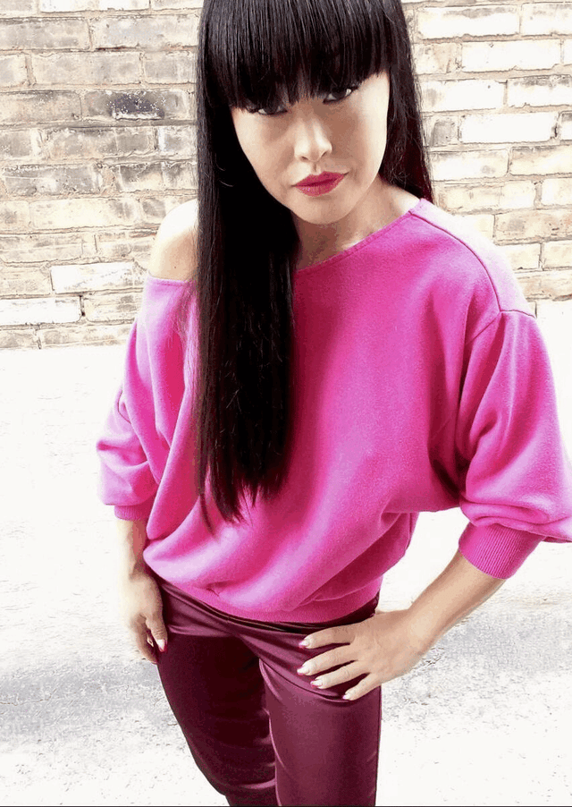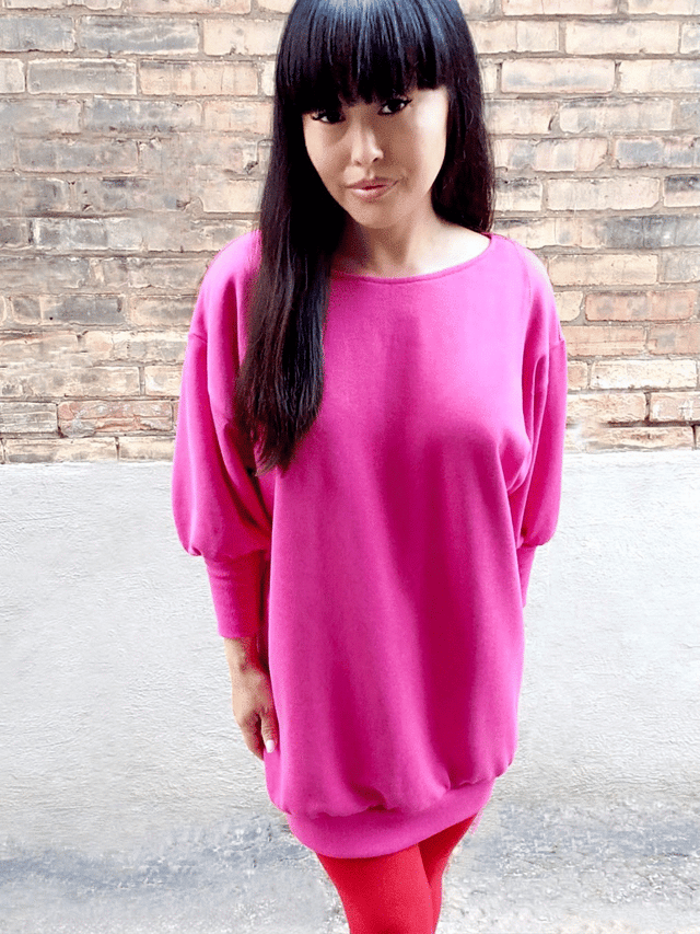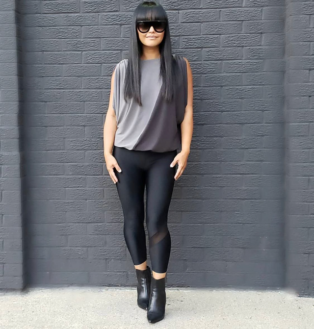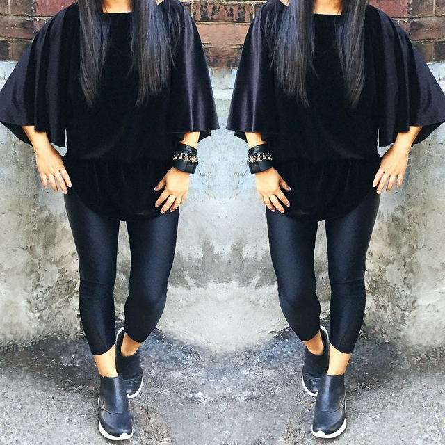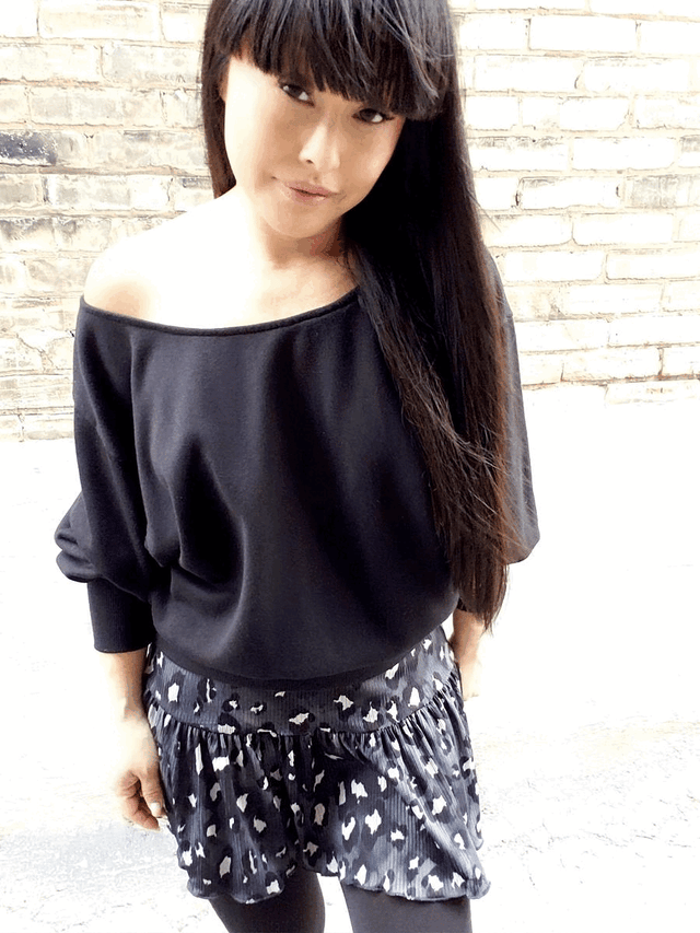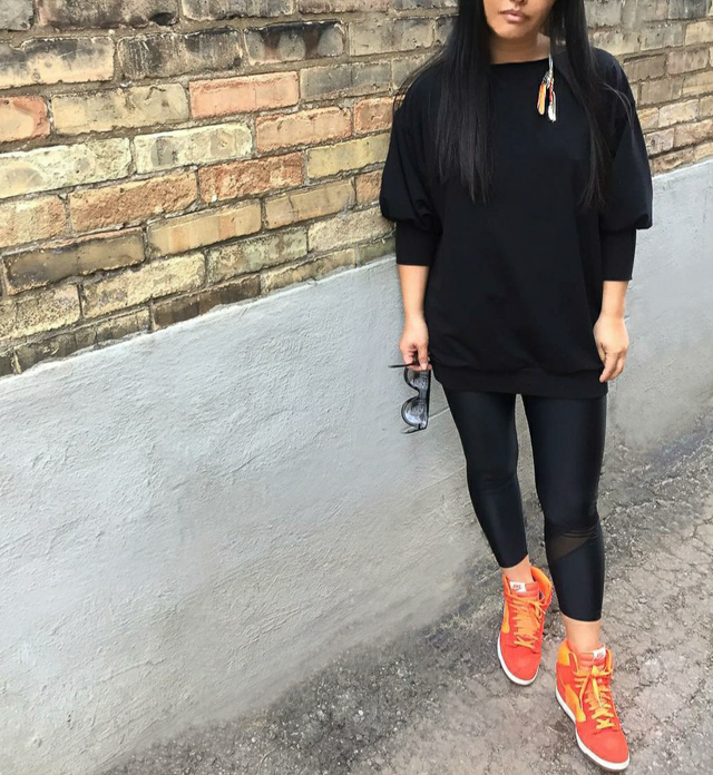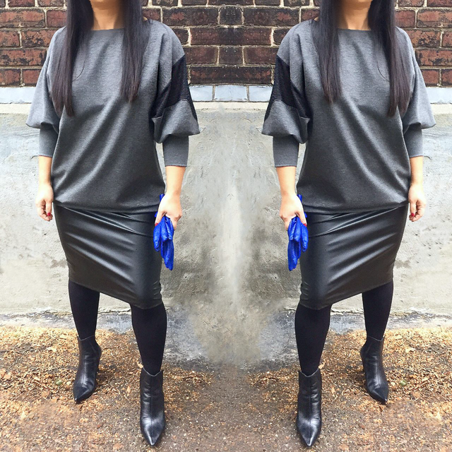 3/4 length sweatshirt with an asymmetrical mesh detail paired with a black fitted pleather skirt.