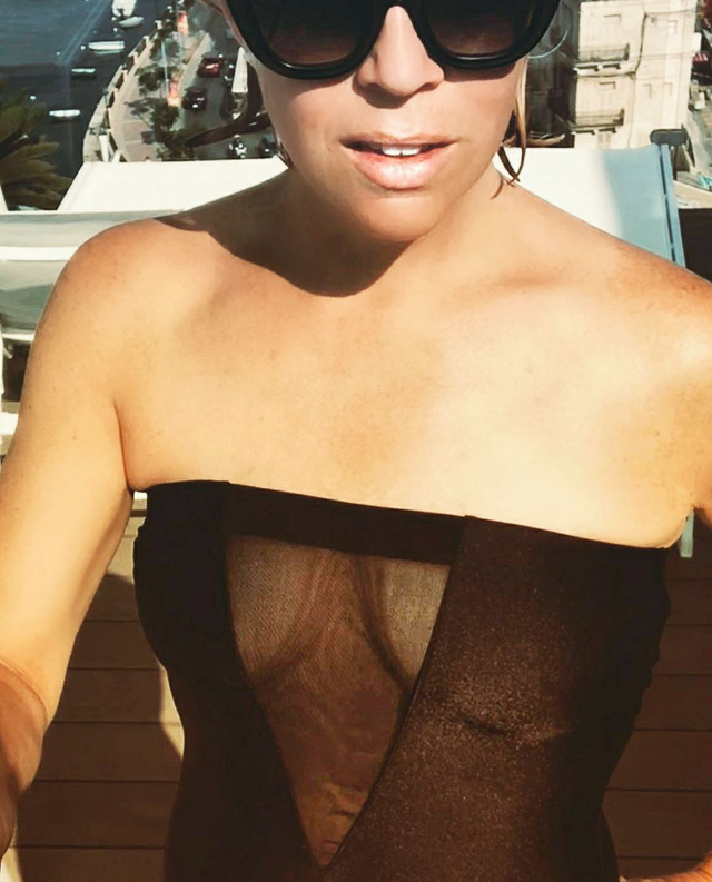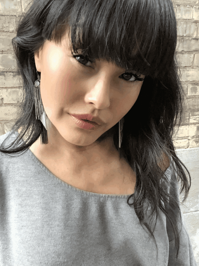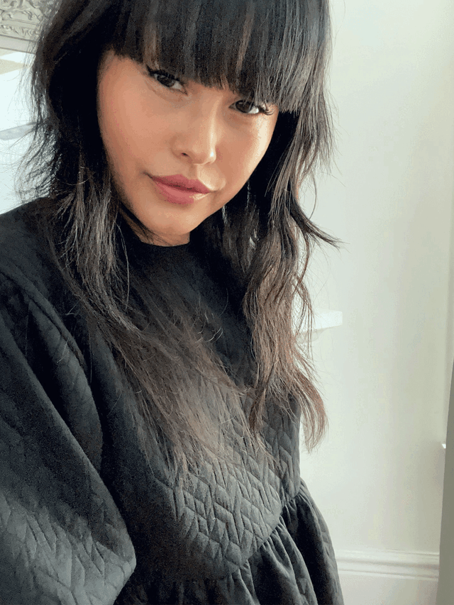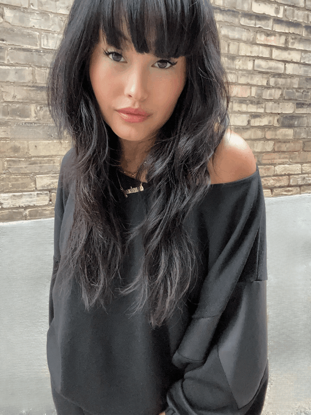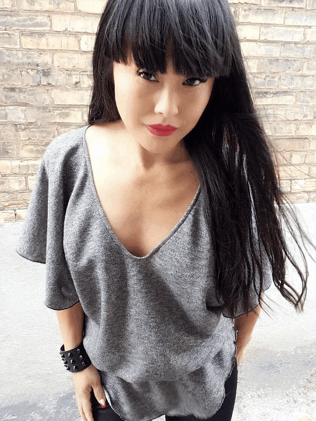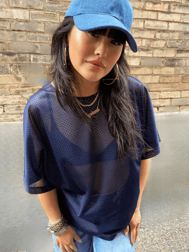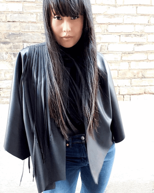 3/4 length sweatshirt with an asymmetrical mesh detail paired with a black fitted pleather skirt.
