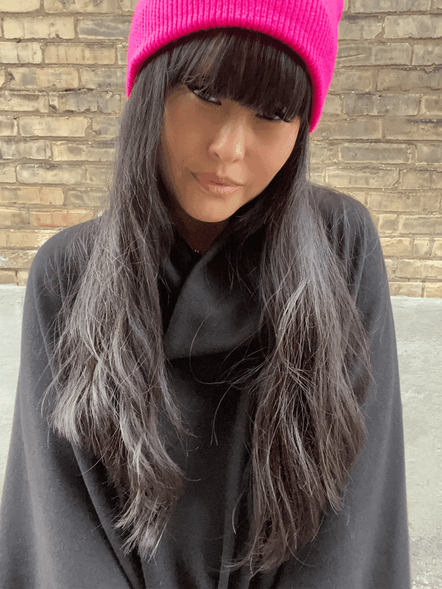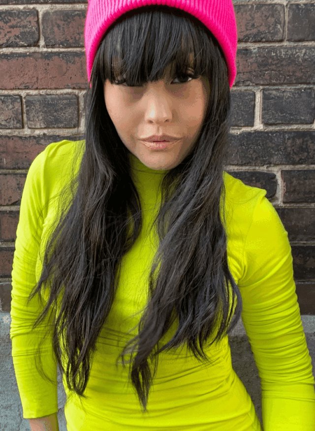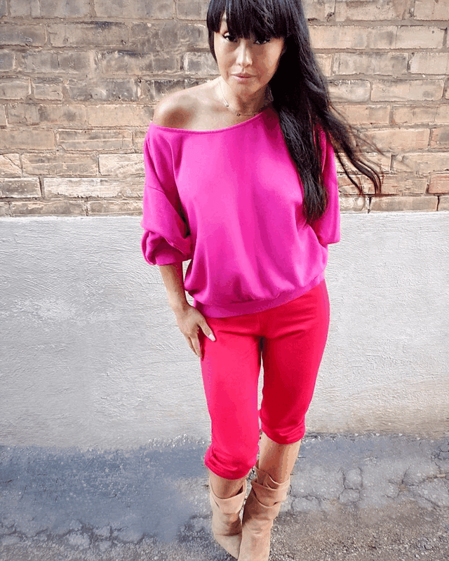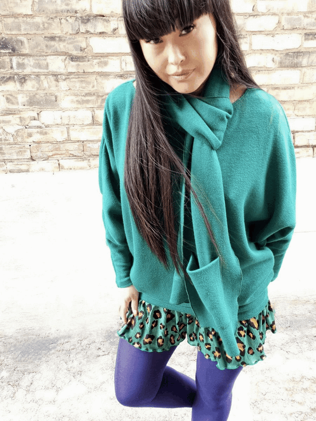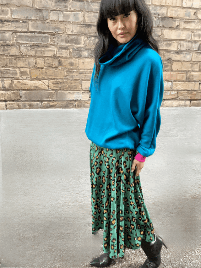 Introducing a full range of hues for the FALL / WINTER season. A stunning TEAL BLUE lightweight, incredibly soft sweater knit with a touch of PINK on the cuffs, matched with a striking kelly green leopard midi skirt for a bold look.