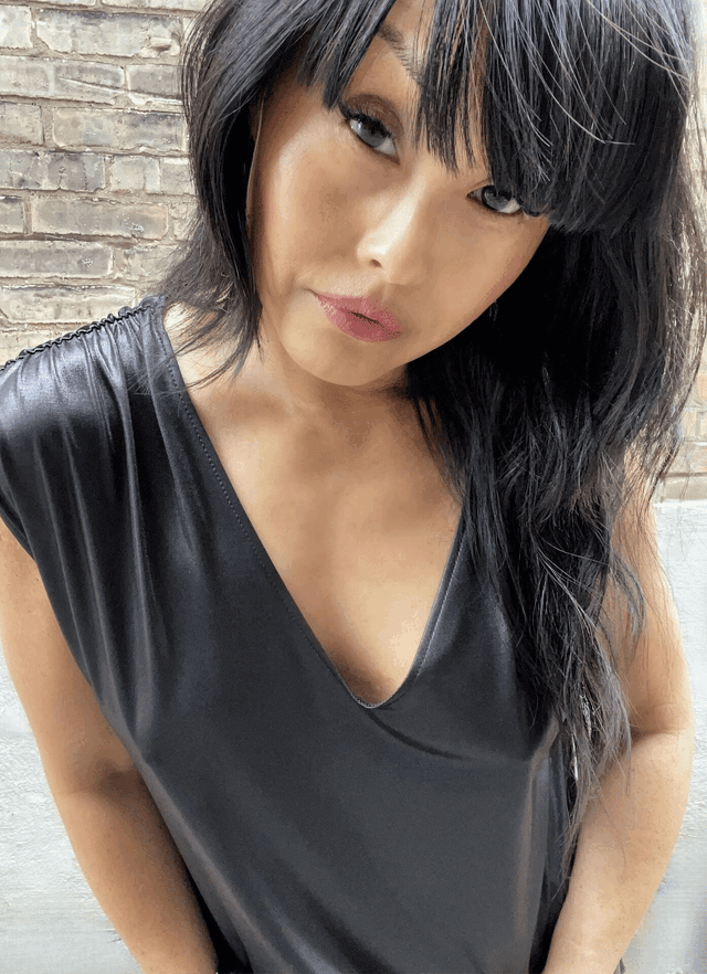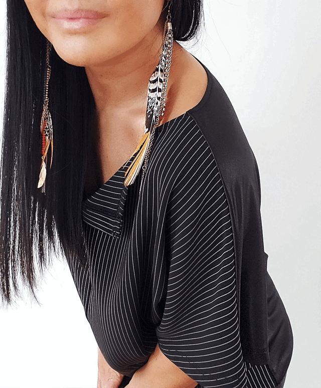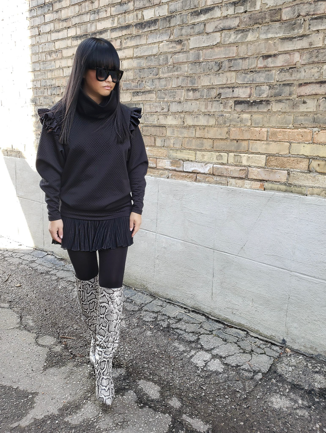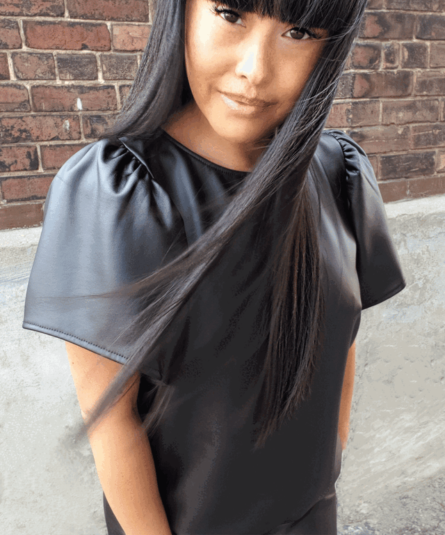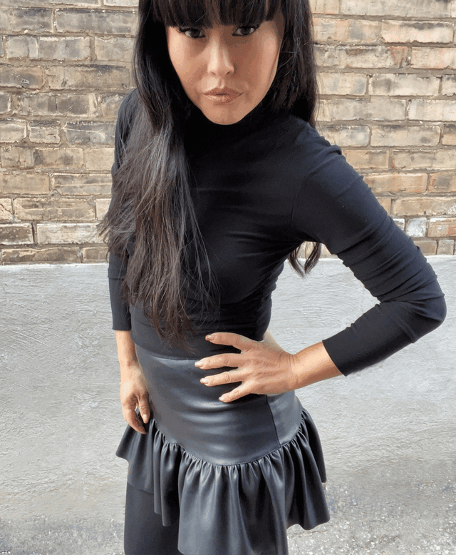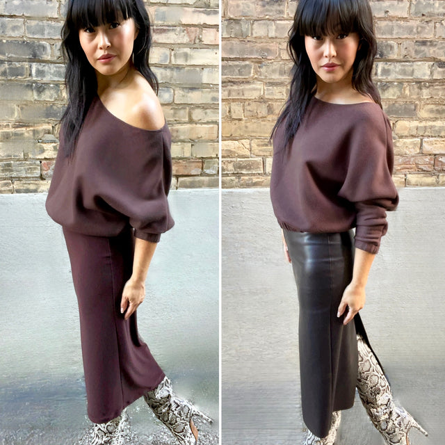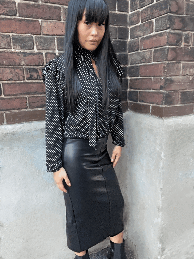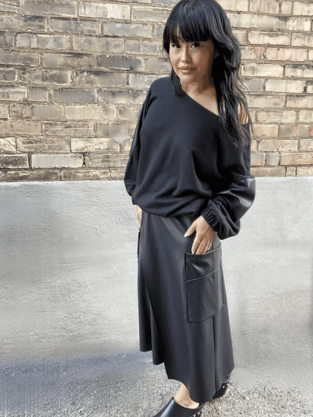 Black lightweight fleece top highlighted by the subtle elegance of geometric-textured pleather sleeve detail paired with the trendiest black vegan leather cargo skirt you've seen.