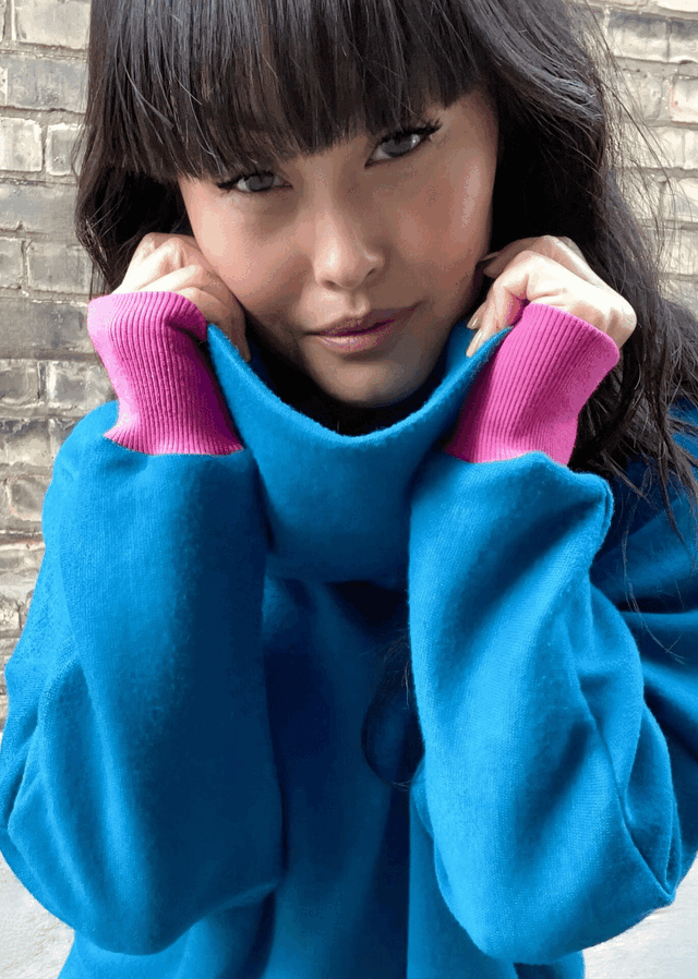 LIMITED EDITION Soft turquoise turtleneck sweater with pink cuffs and chic joggers.