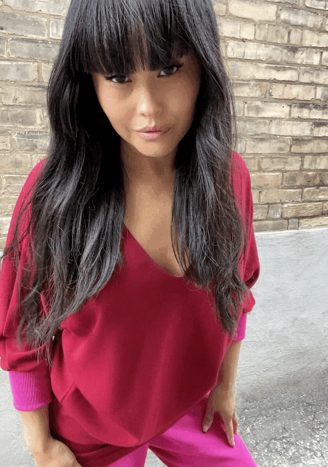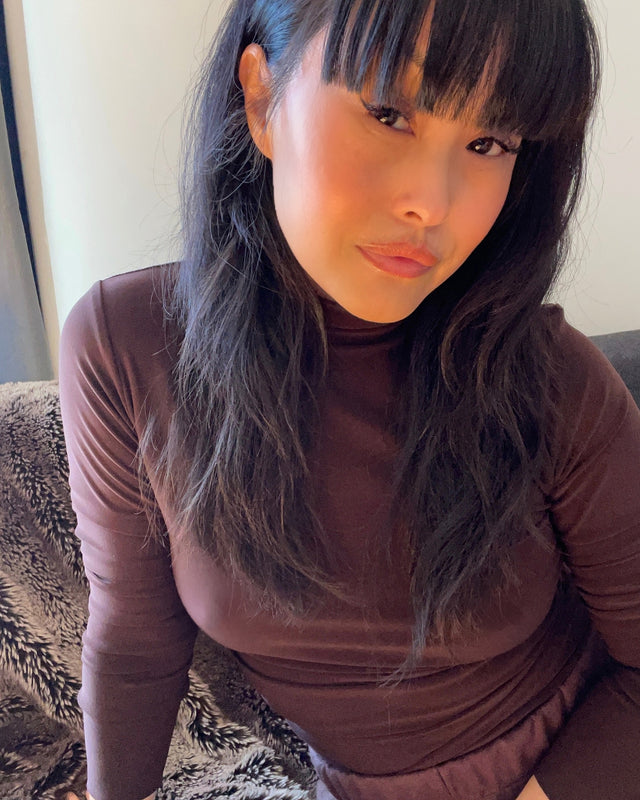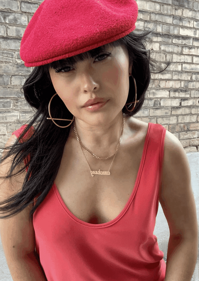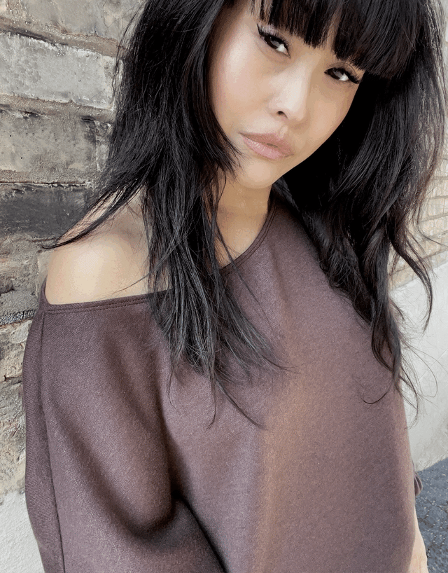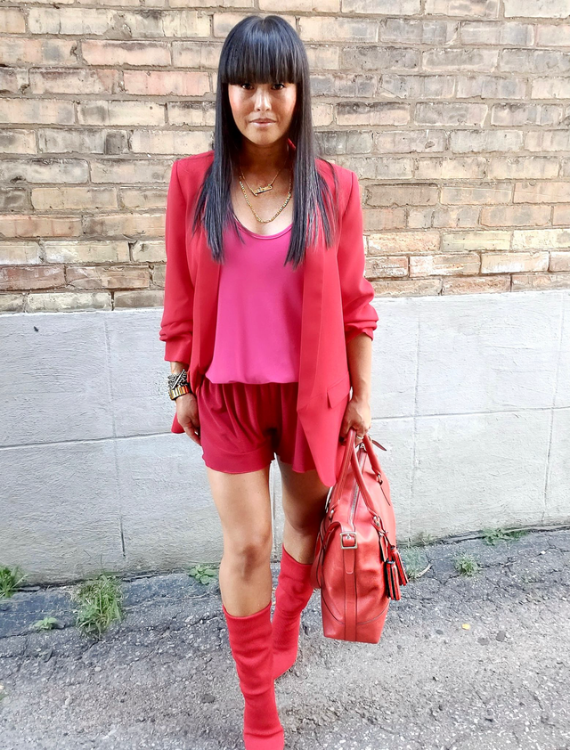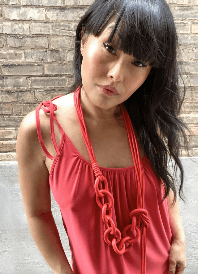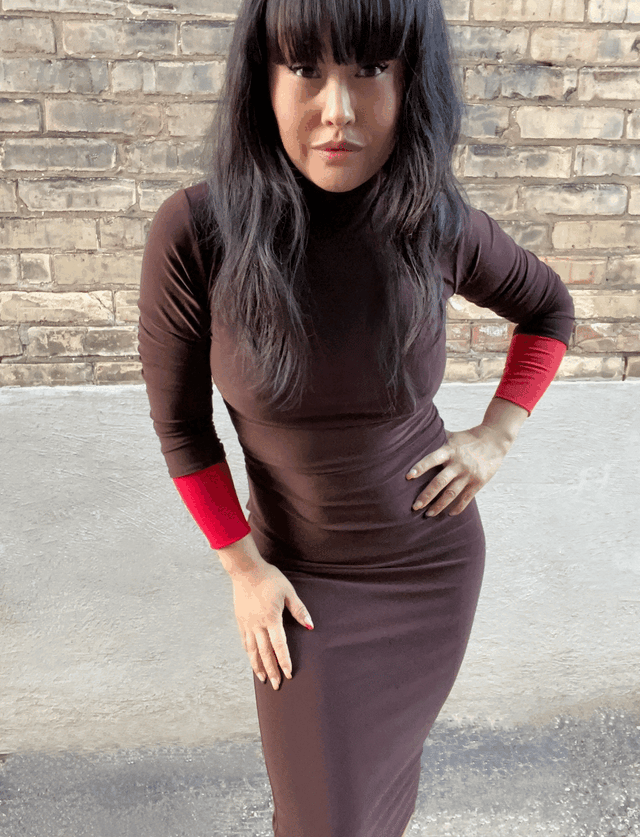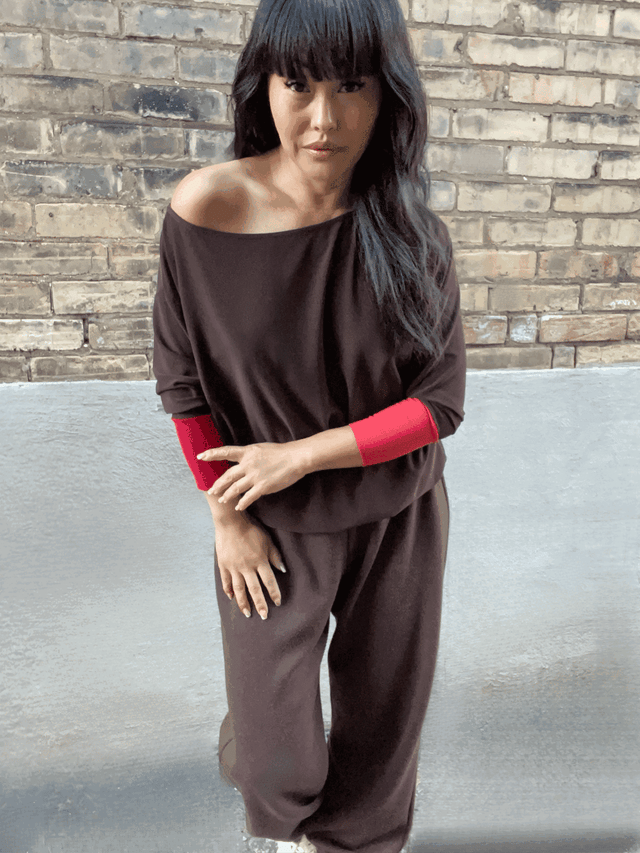 Brown enhances skin tone warmth and radiance. Anne Hung collection prioritizes comfort and distinctiveness with paprika orange and red cuff..