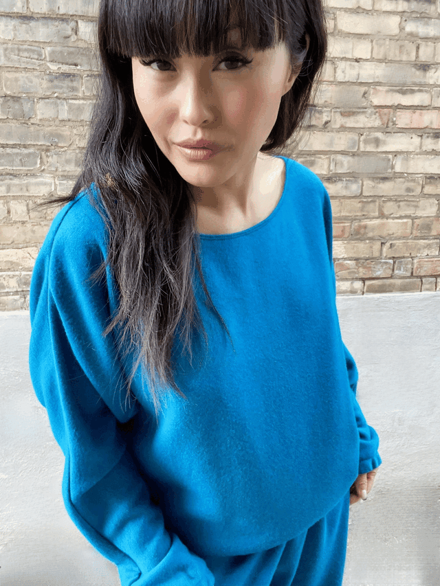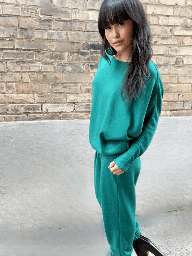 EXCLUSIVE ultra soft turquoise sweater knit in a flash dance style paired with a chic loose pair of joggers.