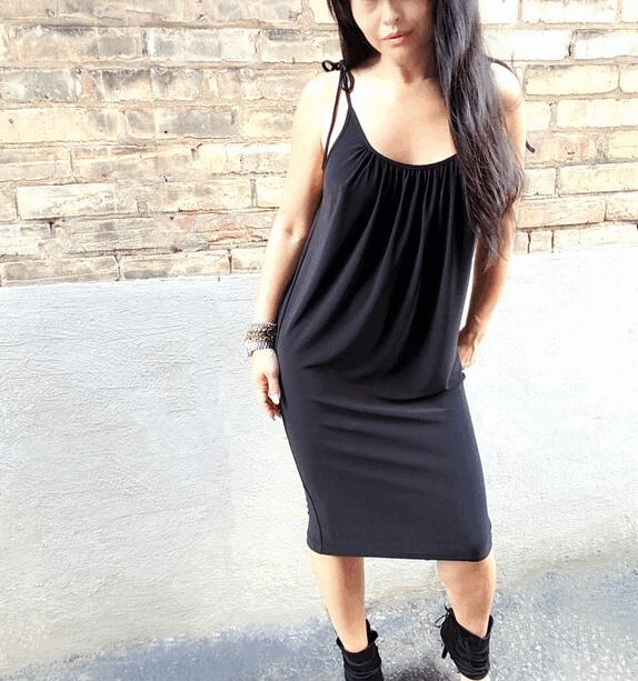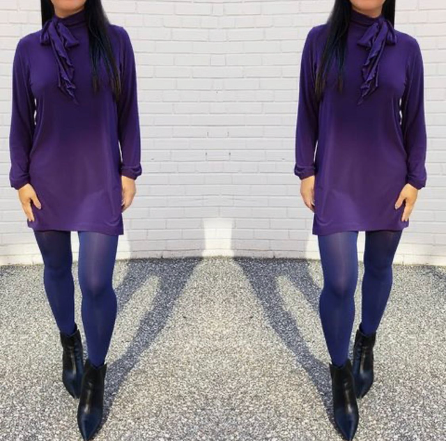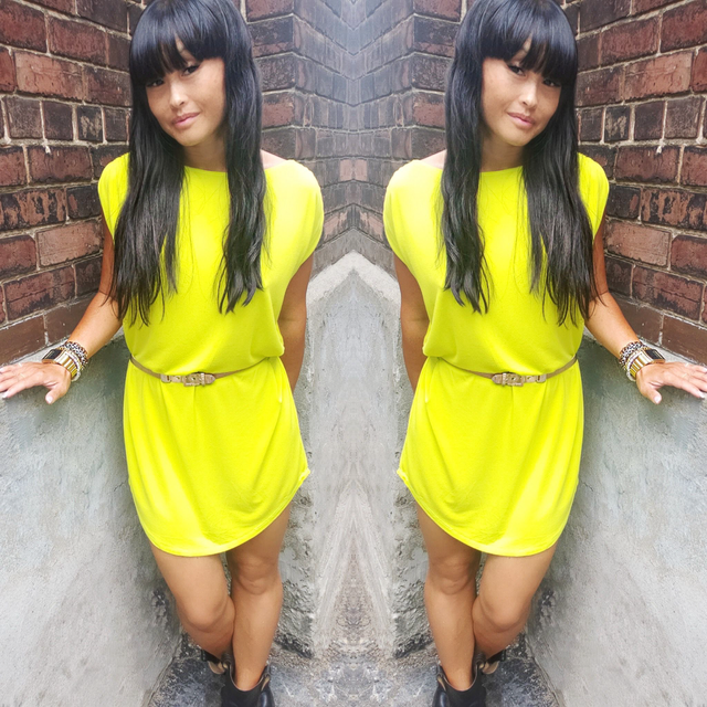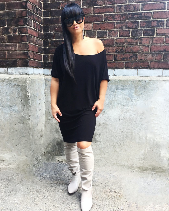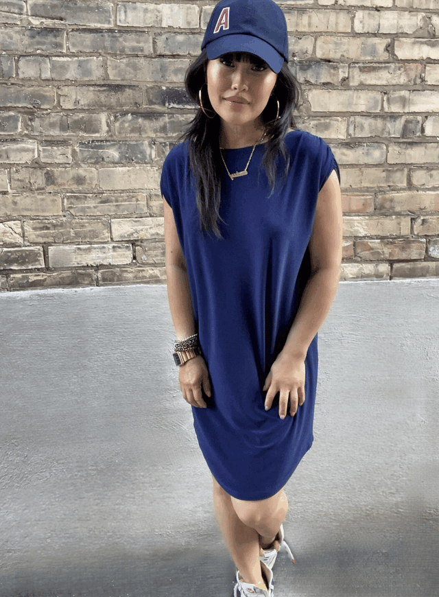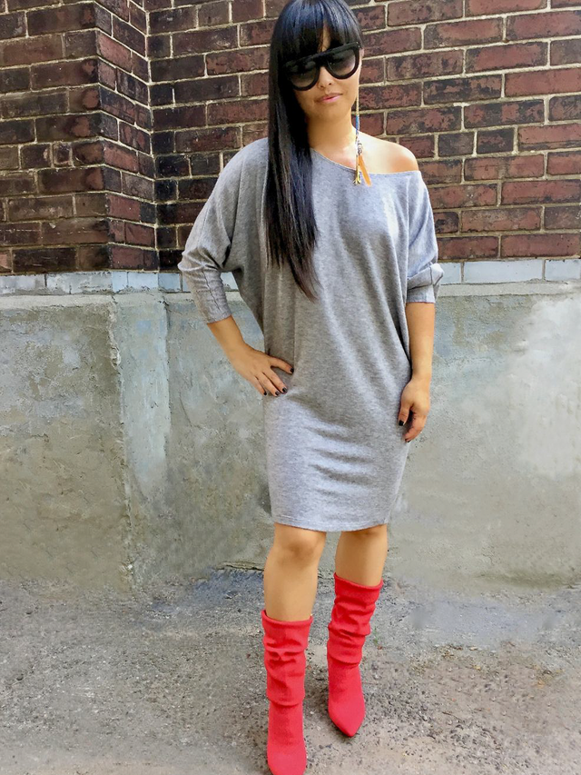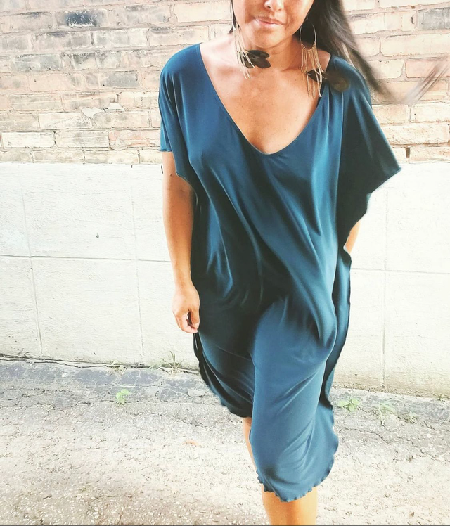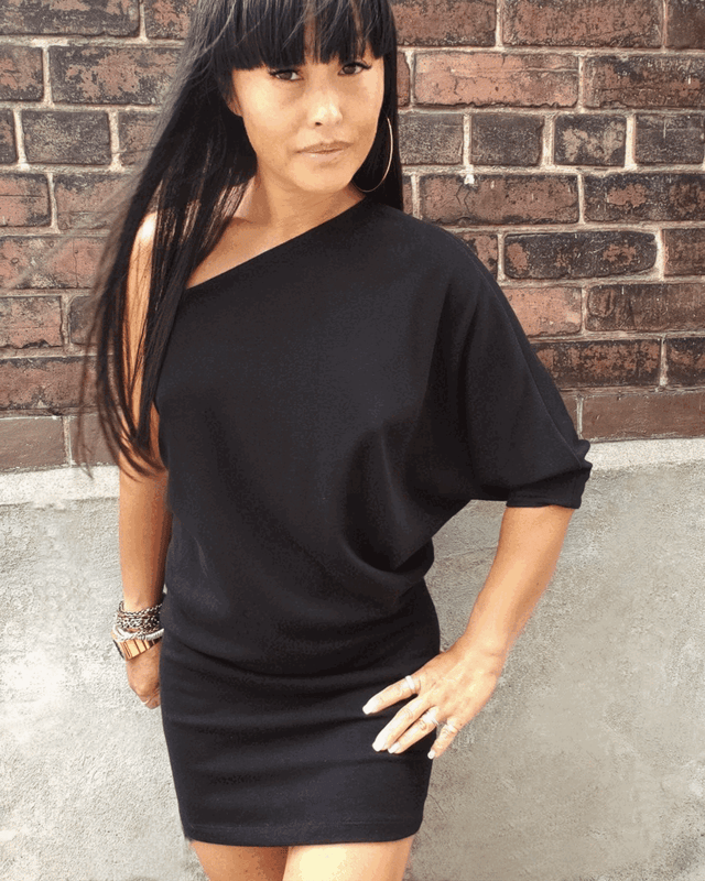 Contemporary jersey t-shirt dress with an incredibly flattering sport hem. T-shirt dress is both comfortable and versatile. Suitable for work and play.