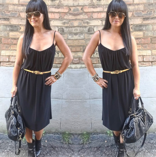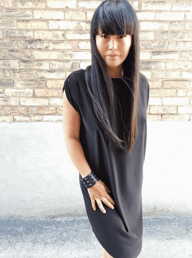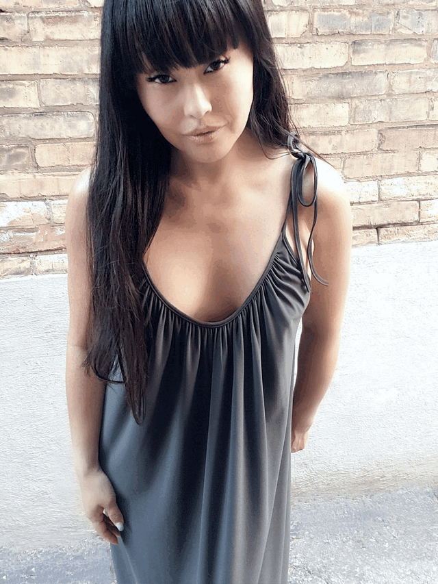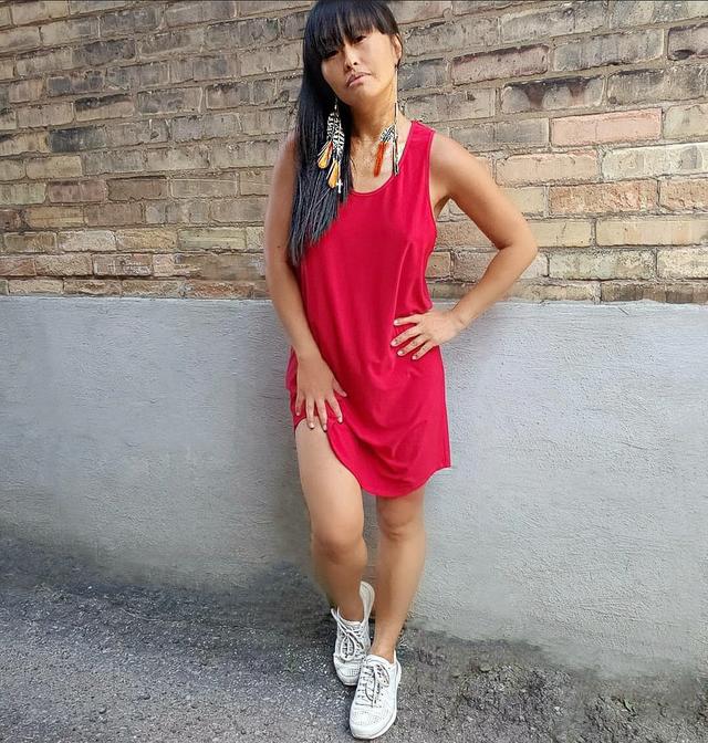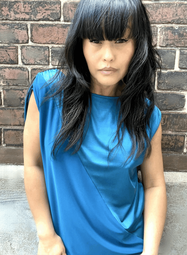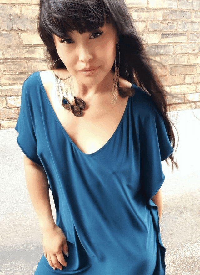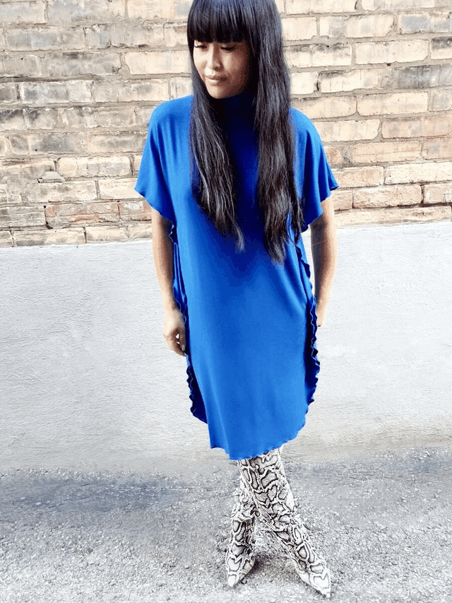 Contemporary jersey t-shirt dress with an incredibly flattering sport hem. T-shirt dress is both comfortable and versatile. Suitable for work and play.