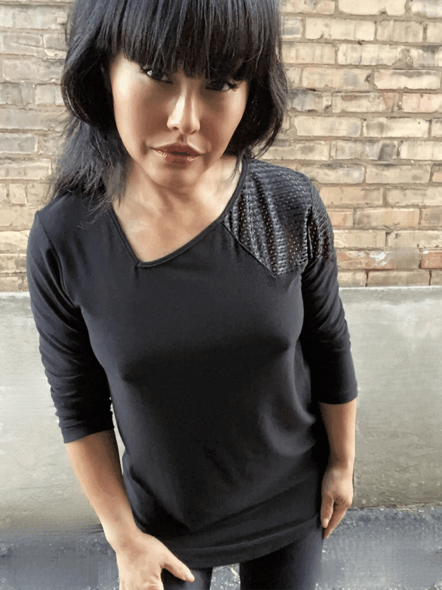 An essential distinctive asymmetrical neck long sleeve top with a striking asymmetrical sport mesh detail on the left shoulder and a slimming sport hem.