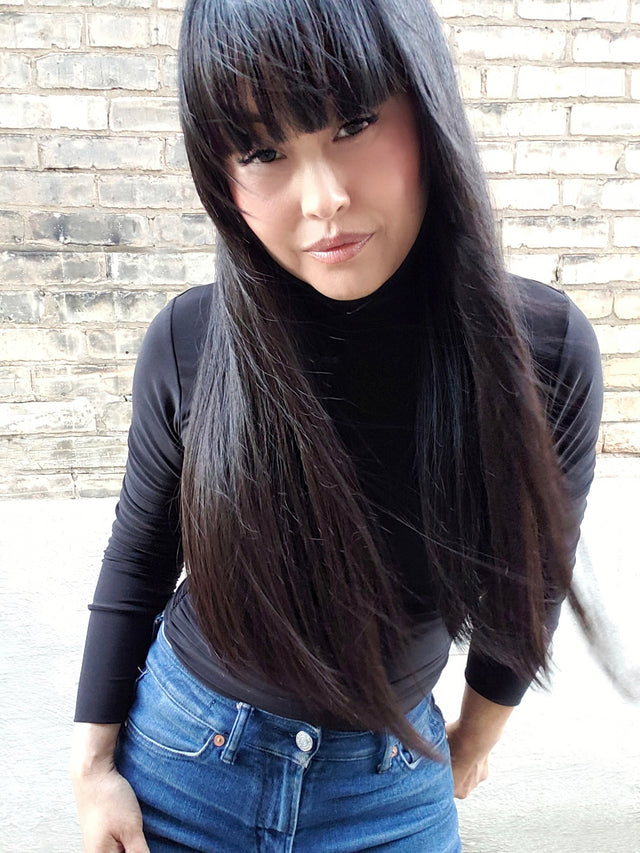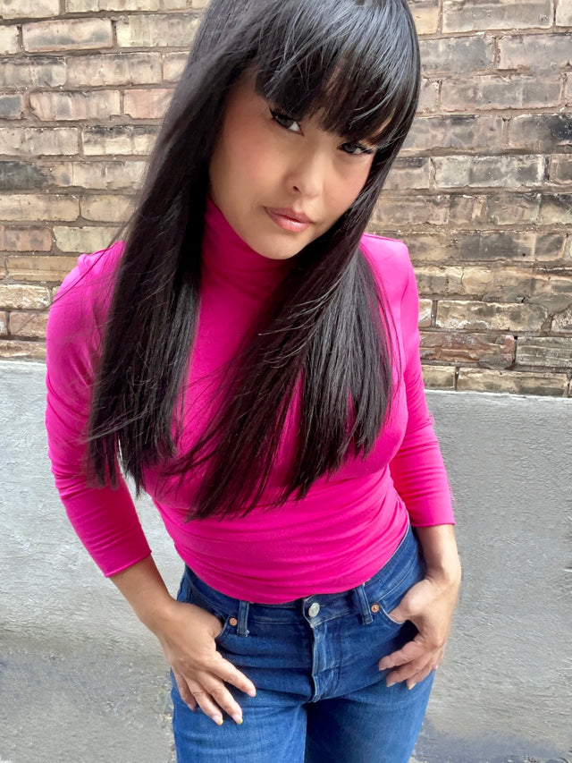 Unique turtleneck top featuring a quilted design, ruffle shoulder detail, slim long sleeve, and flattering hem.