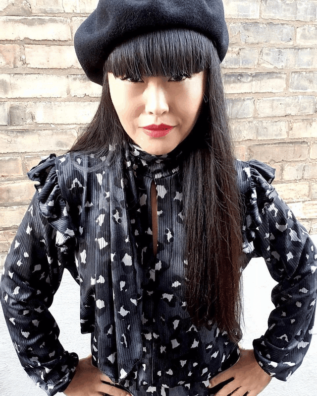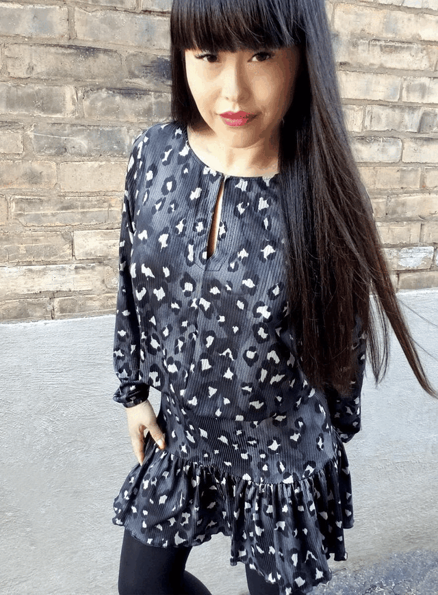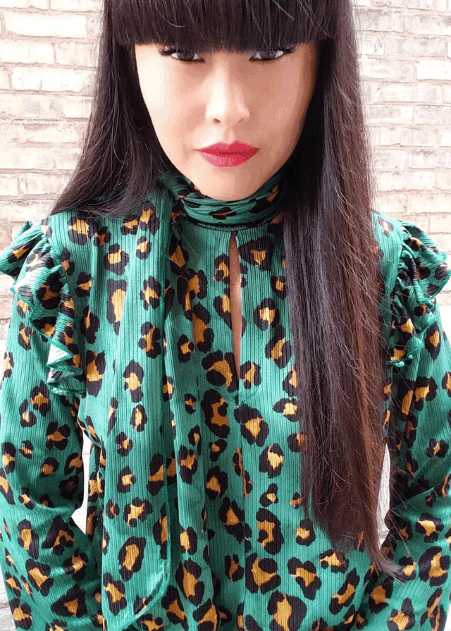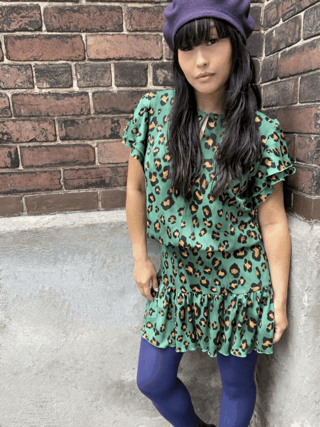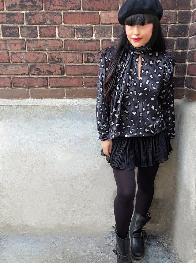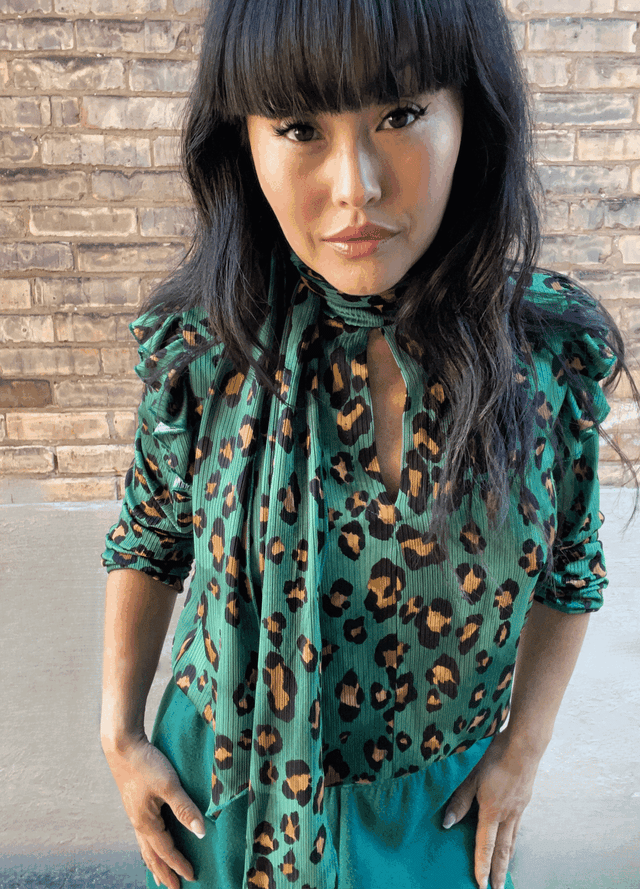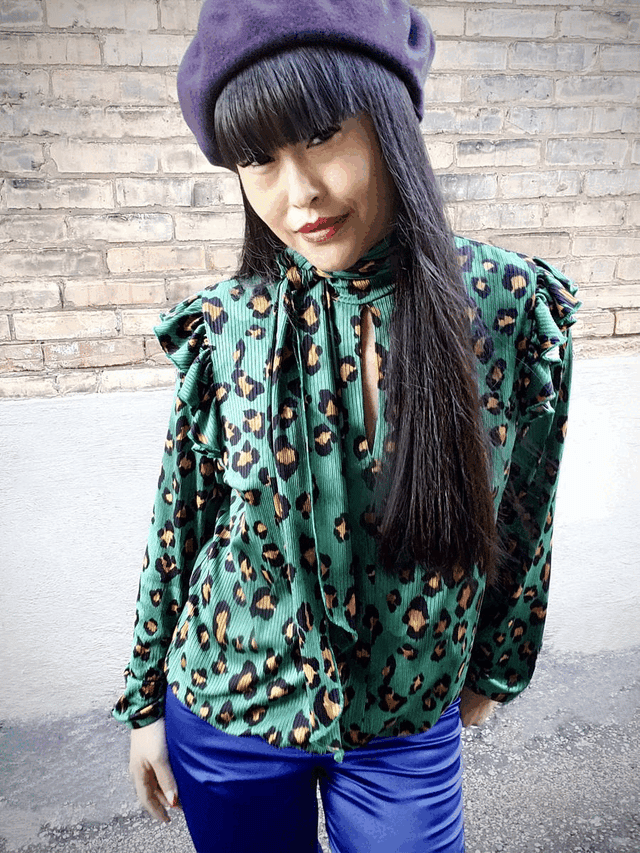 This is the top LEOPARD PRINT with a POPART essence and timeless vibe. A wardrobe essential. Try it with a chic turtleneck neck-sash and ruffle shoulder detail for a sophisticated look. Pair with loose emerald green track pants for a stylish ensemble.