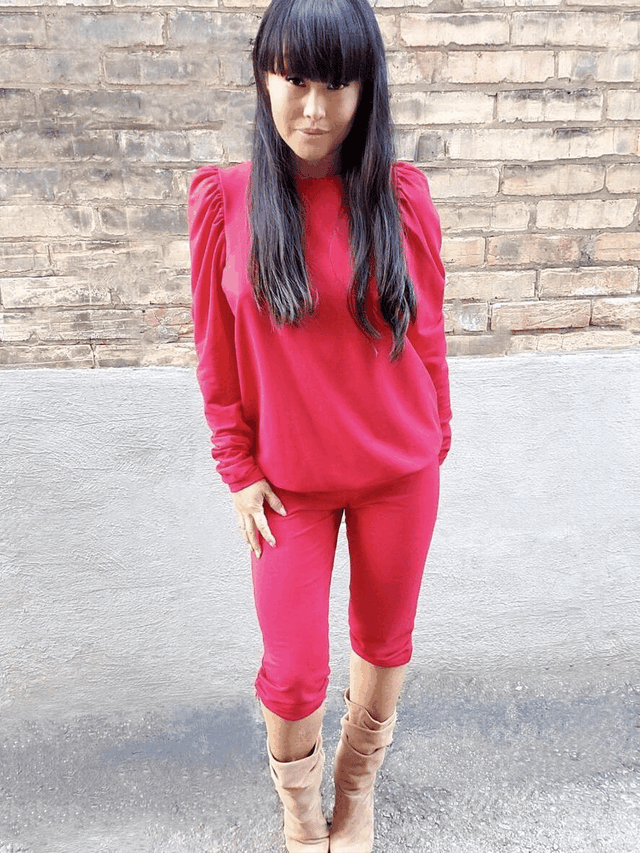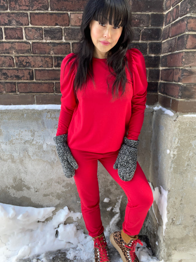 Crimson red ponte fleece puff sleeve top and coordinating slim joggers.