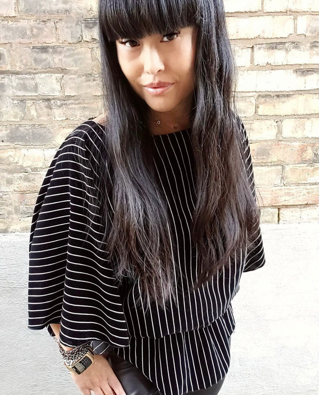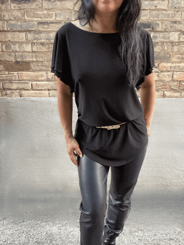 Black double layer ruffle short sleeve top with sport hem for a slim yet loose look.
