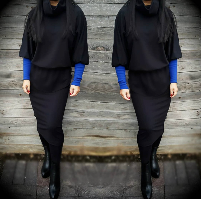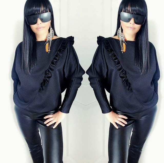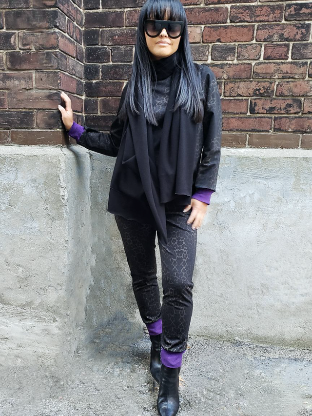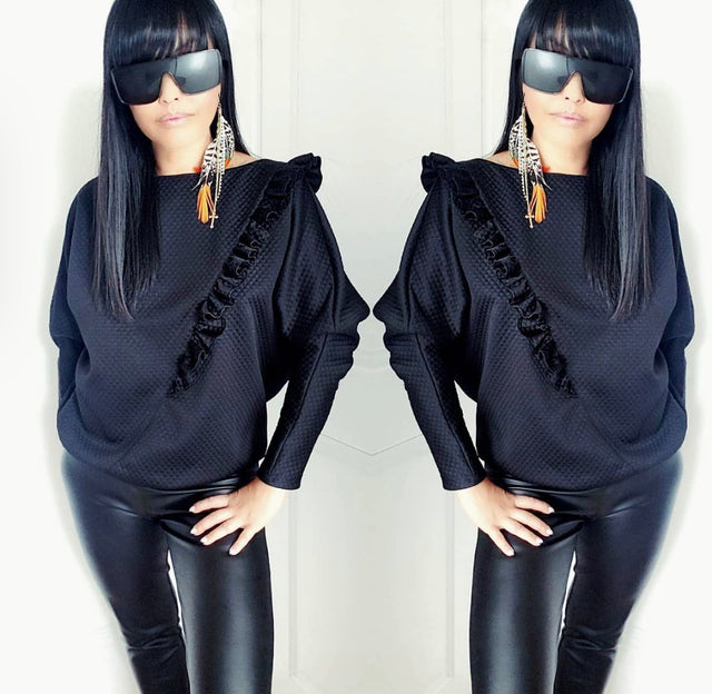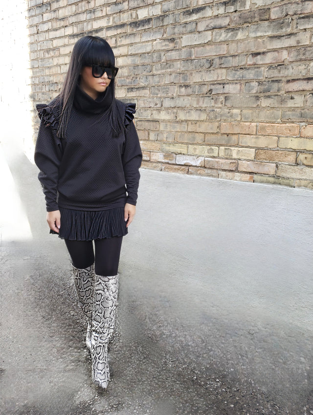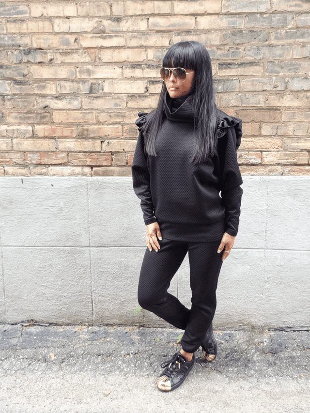 A unique black light weight quilted ruffle turtleneck top with matching slim joggers.