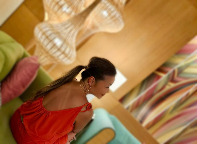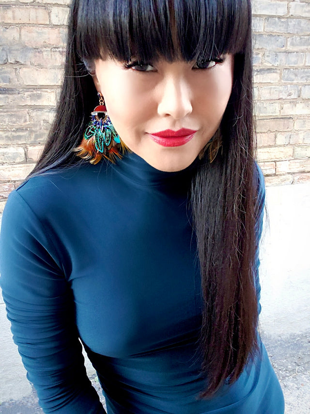 Elevating an ANNE HUNG cozy fabulous tracksuit with multi color metal earrings.