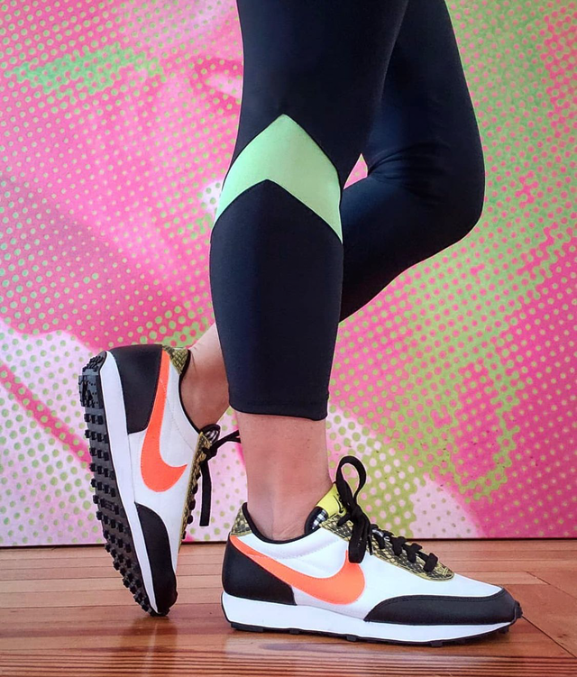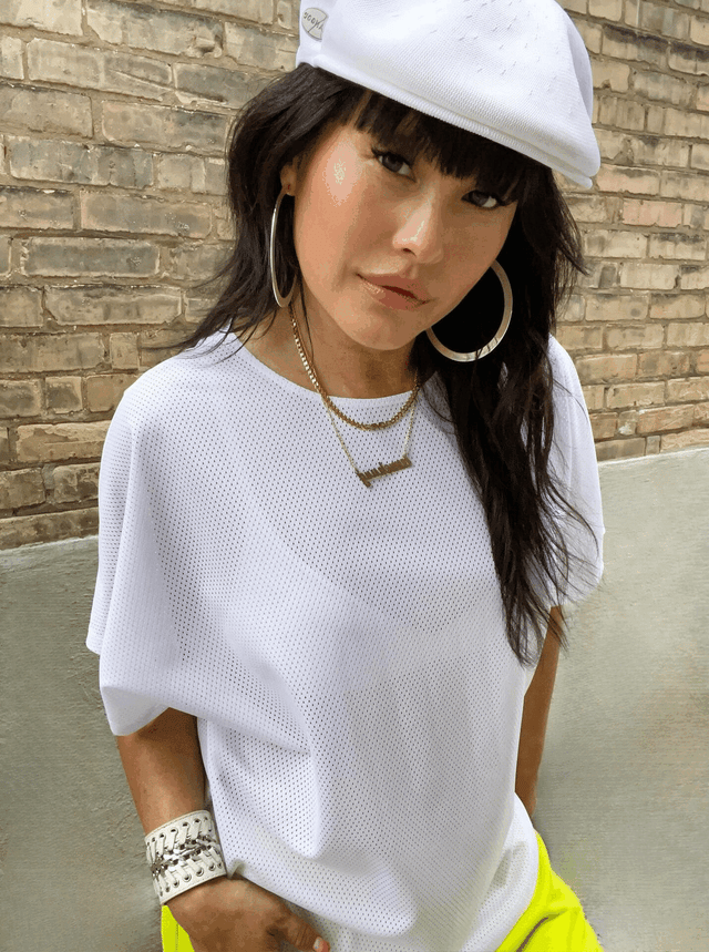 The ESSENTIAL white sport mesh top matched with a sleek neon track pant.