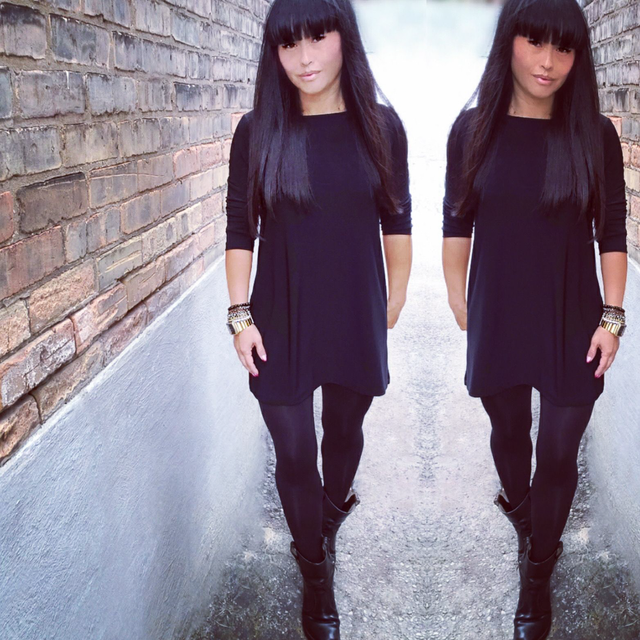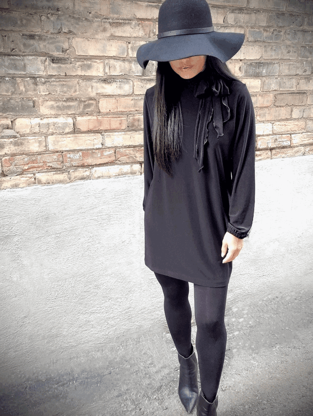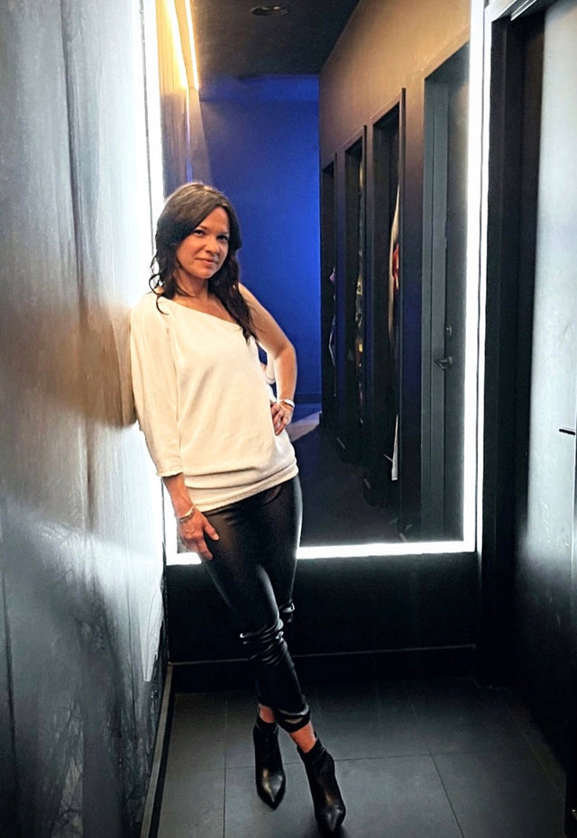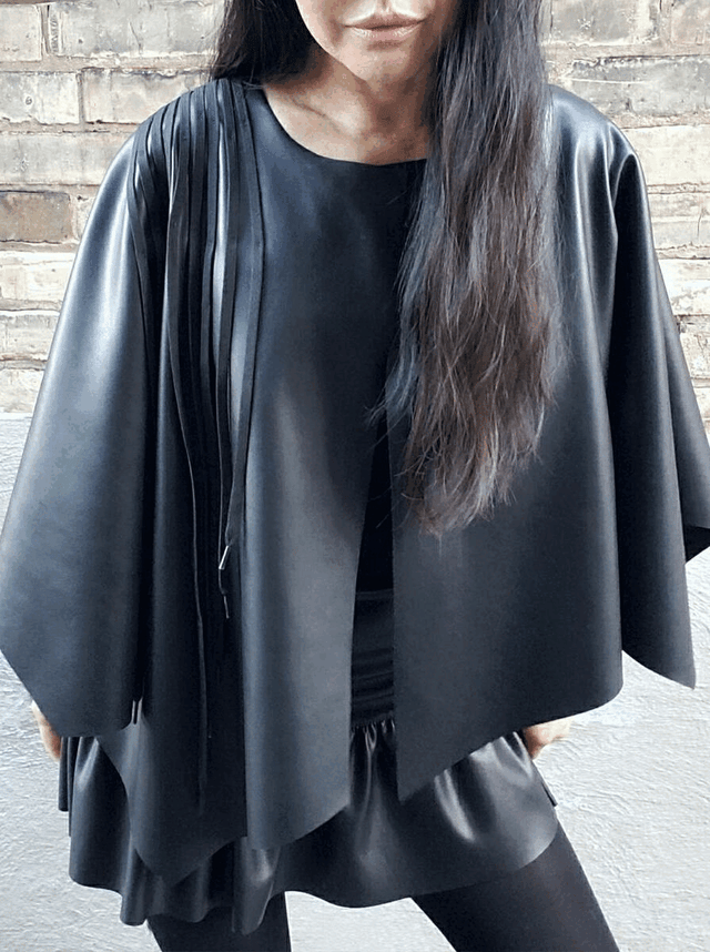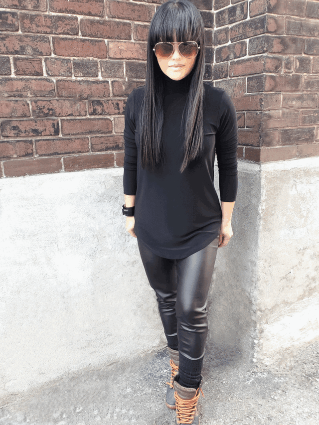 Sleek black tunic with asymmetrical drawstring design paired with vegan leather joggers featuring 1.5" elastic cuffs.