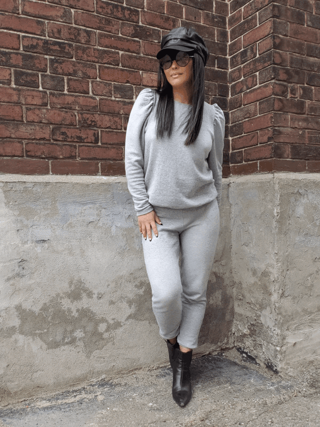 Light grey puff sleeve sweatshirt and jogger set in terrycloth fabric.