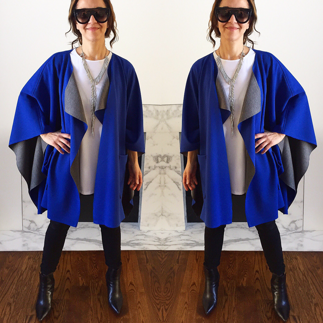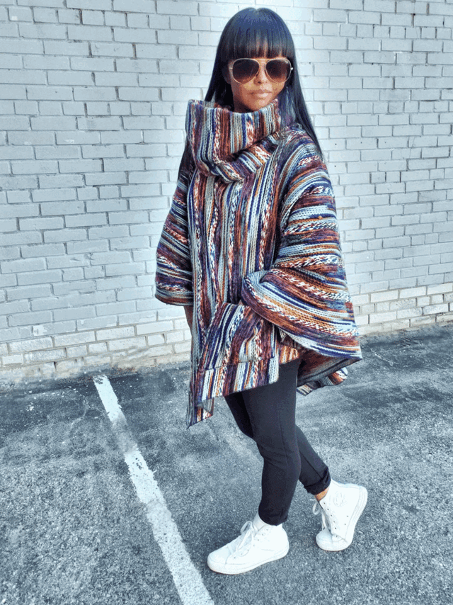 Blue multi-colour sculpted turtleneck poncho with an asymmetrical hem.