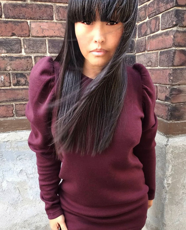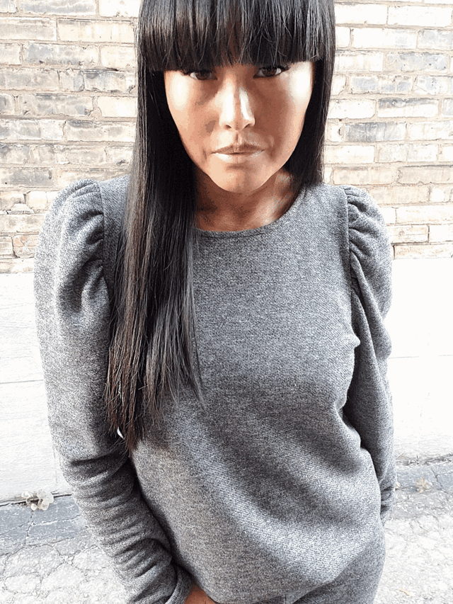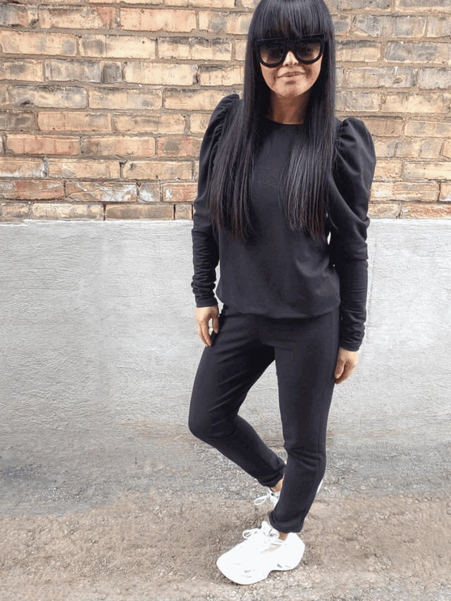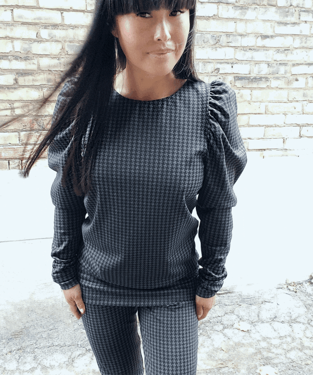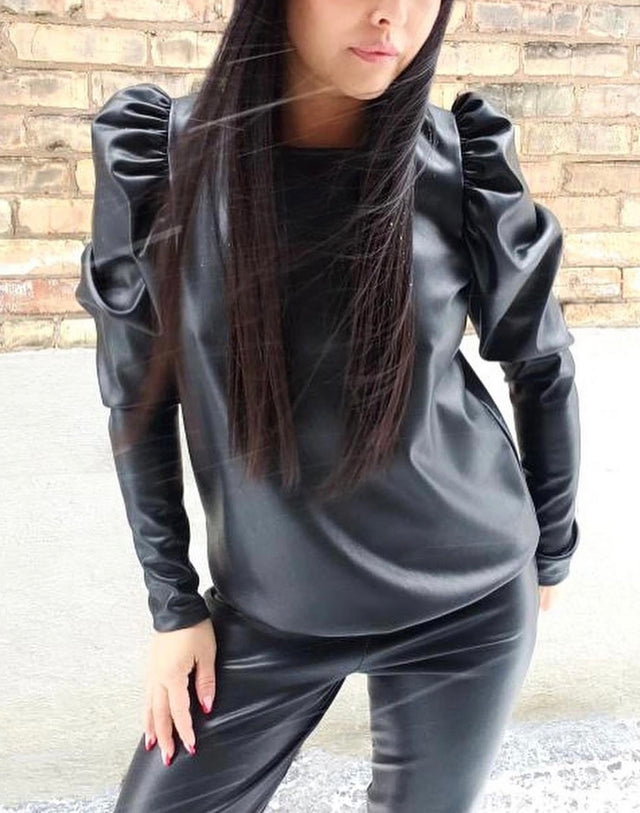 Black ponte fleece 3/4 length puff sleeve sweatshirt.