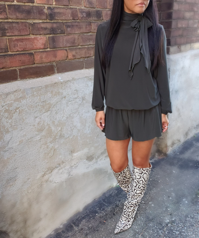 Olive jersey turtleneck sash tie top. Elastic waist flirty jersey shorts.