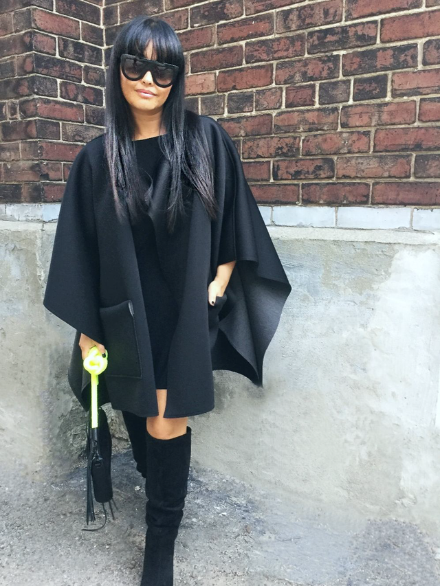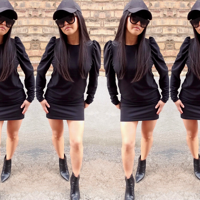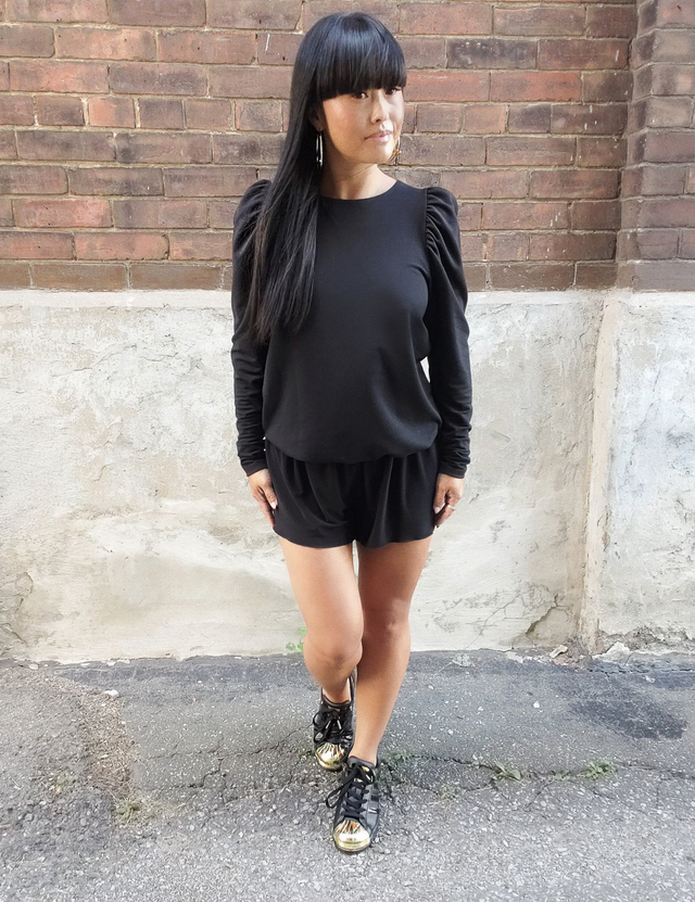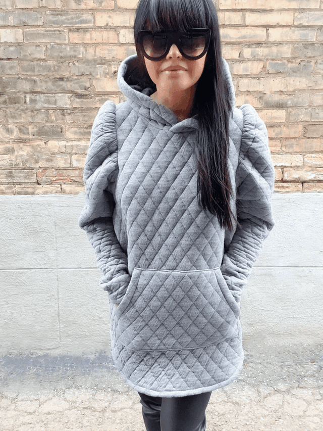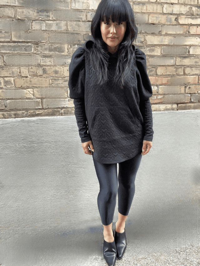 Adult hoodie alert: A black quilted puff sleeve hoodie suitable for all seasons, paired with ANNE HUNG leggings for a stylish combination.