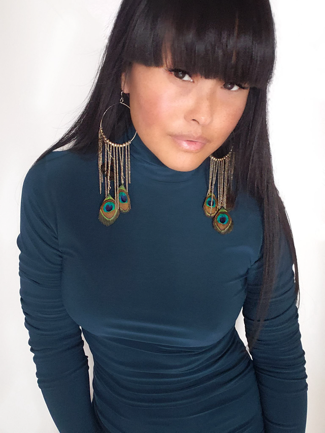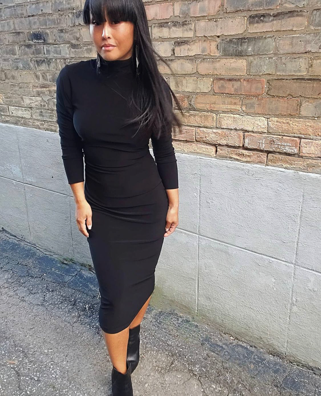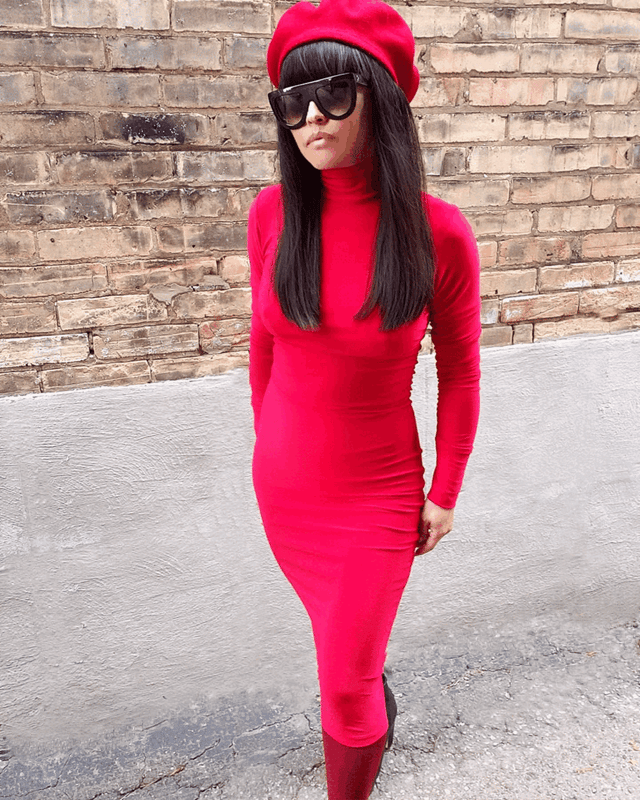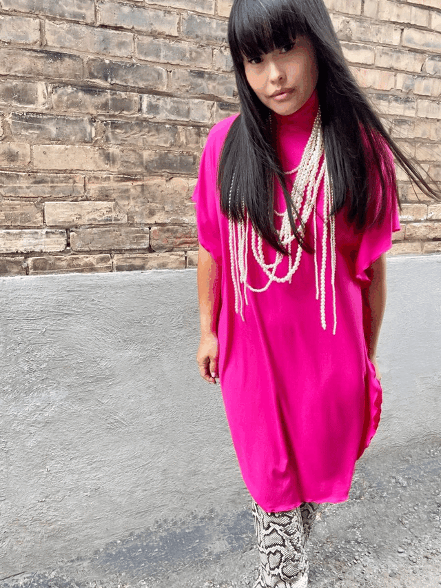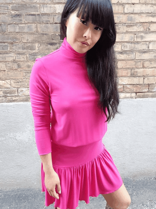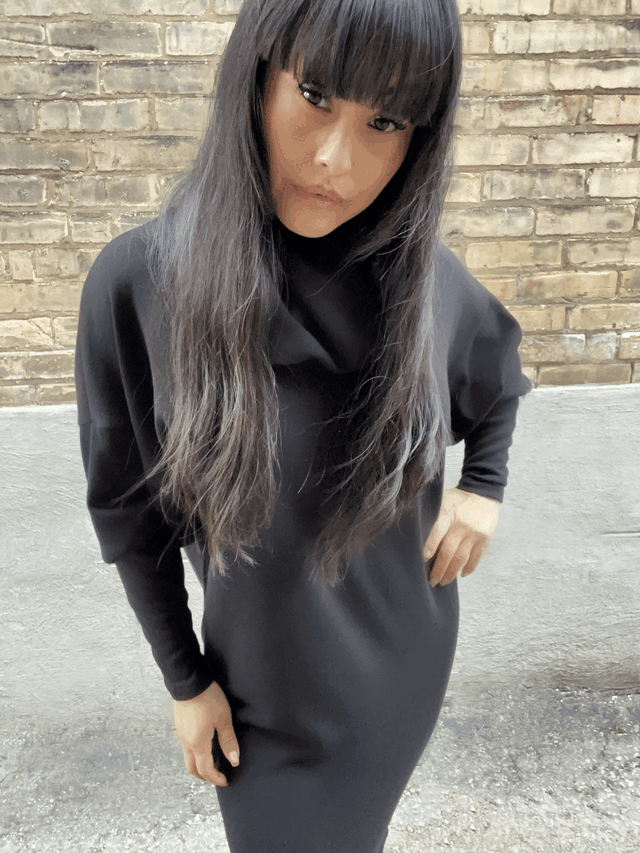 Split kimono sleeve turtleneck jersey dress with a cinched waist amd a fitted skirt.