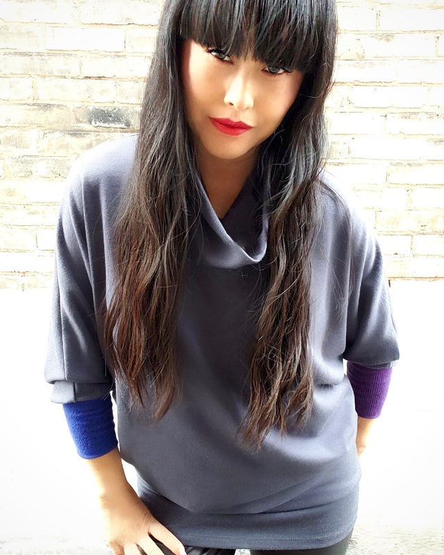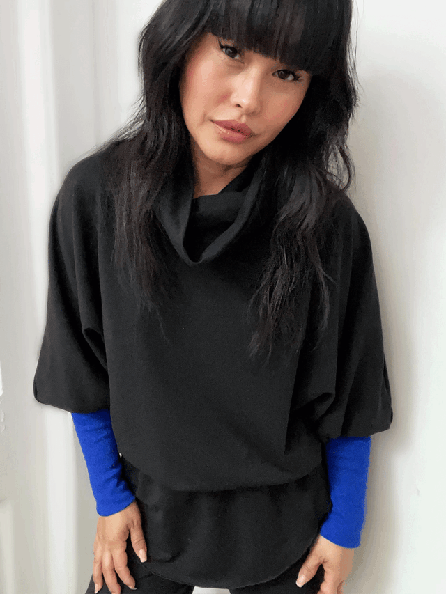 Black ponte fleece turtleneck top combines cobalt blue rib elongated cuffs, a cinched waistband, and a slimming sport hem.