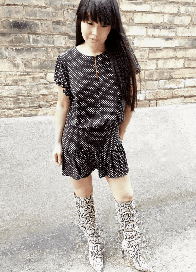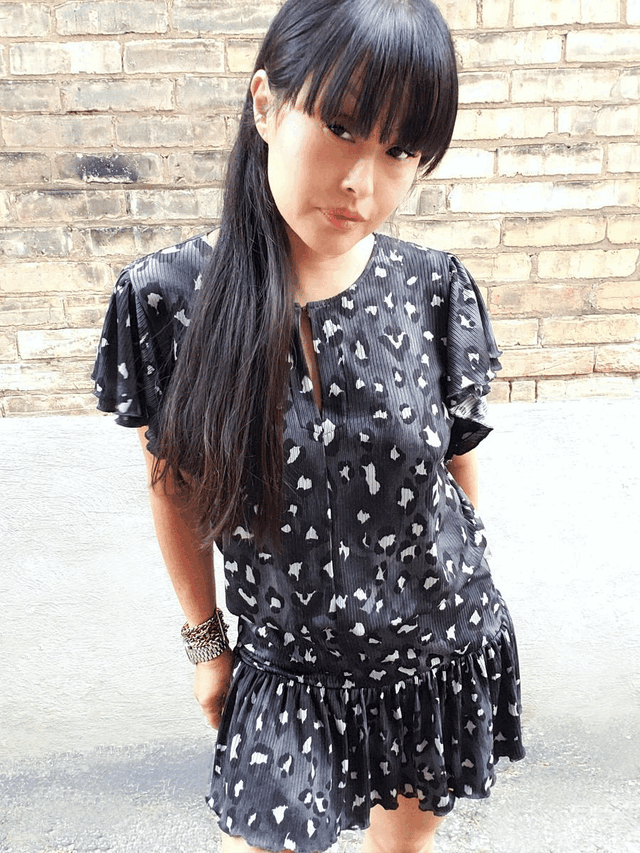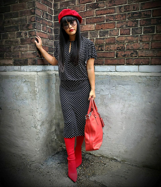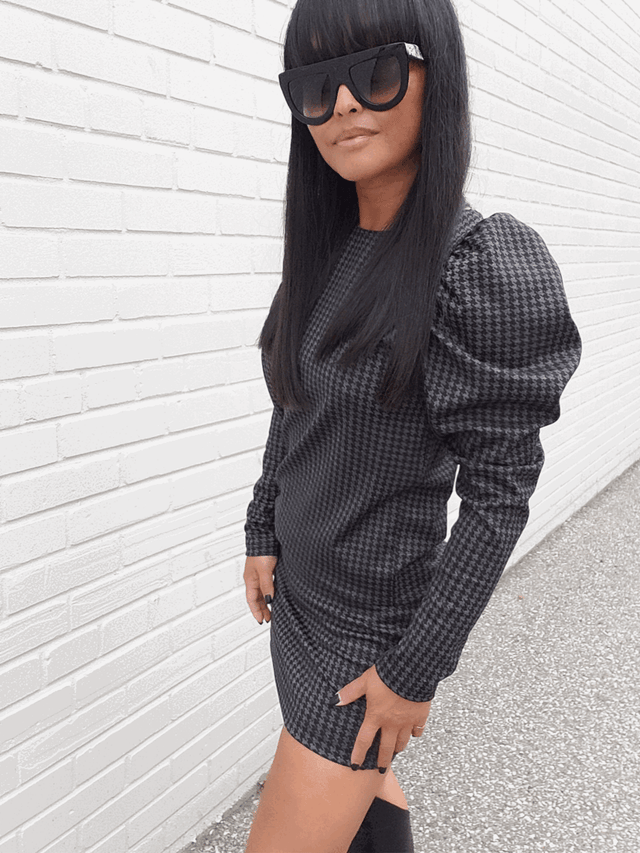 Polkadot dress in black & white with ruffle sleeves, cinched waist, and tailored skirt.