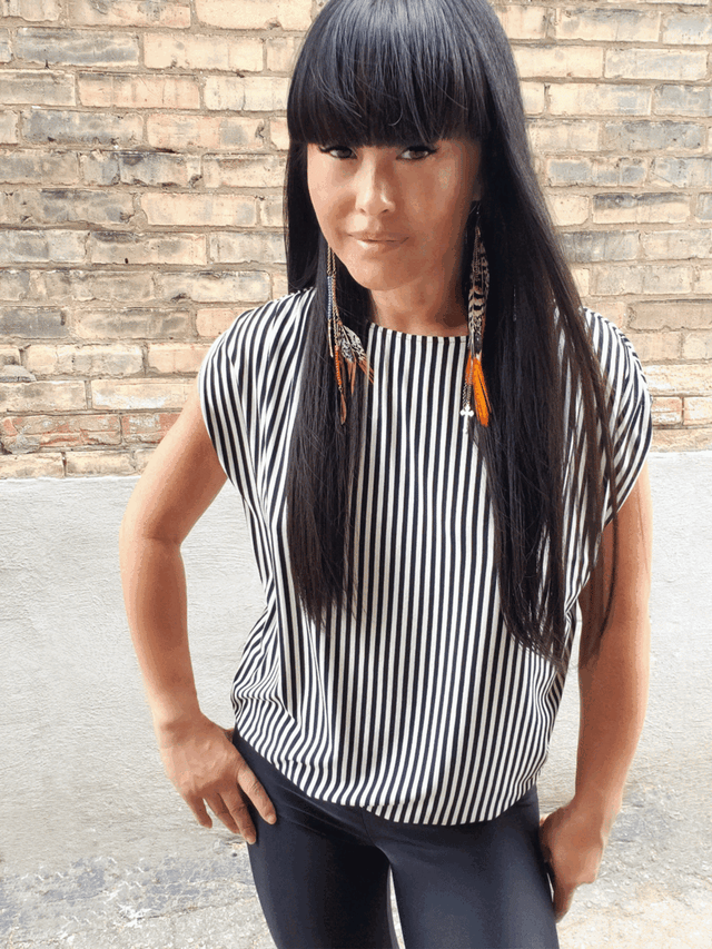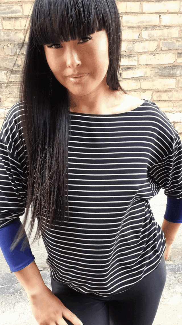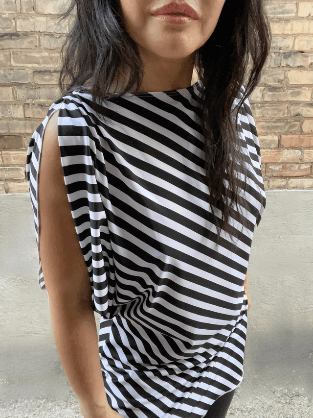 A modern t-shirt combining a classic pinstripe front with a shiny stretch fabric back.