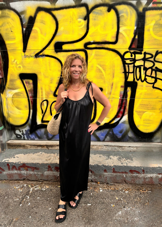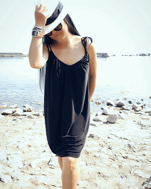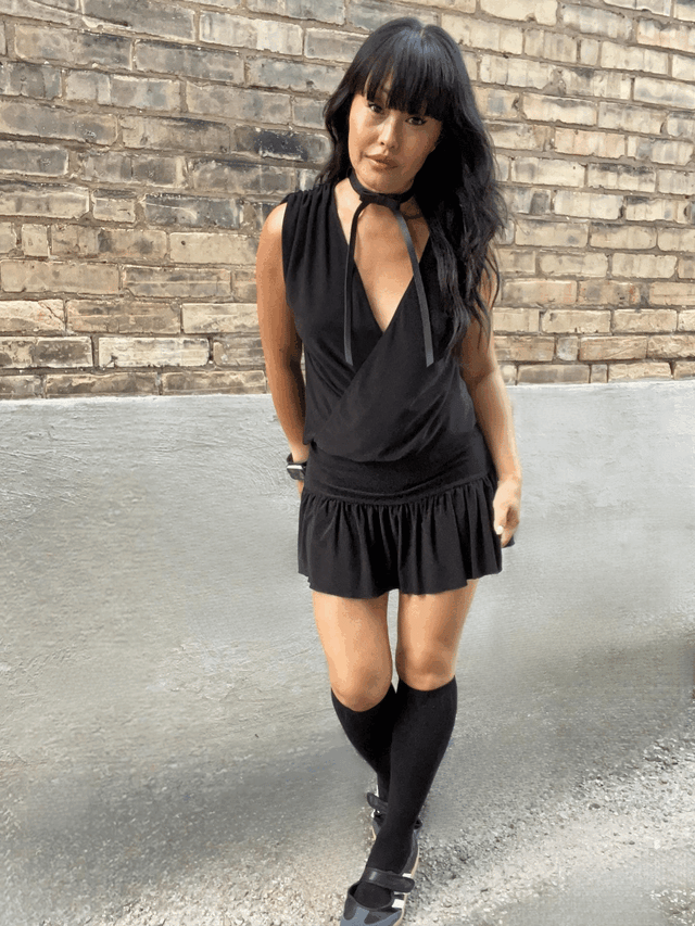 Liquid black tie back shorts jumper, high front, low back neckline.