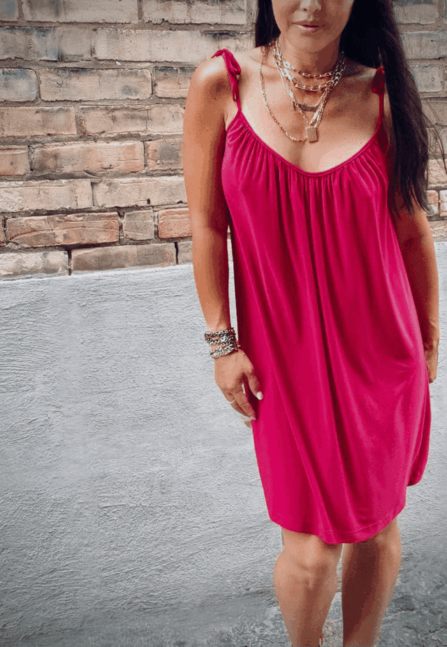 Paprika jersey adjustable shoulder strap slim-in tank dress with a high front and low back neckline.