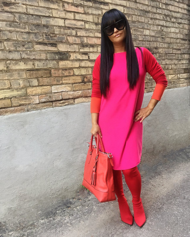 3-tone dress with fitted ruched sleeve, a-line silhouette with a sport hem.