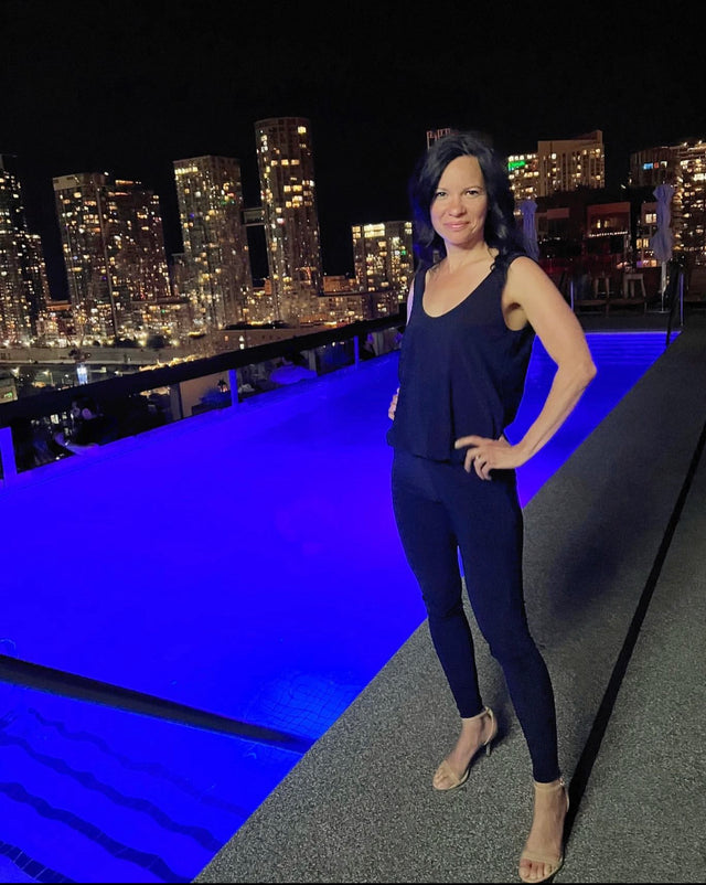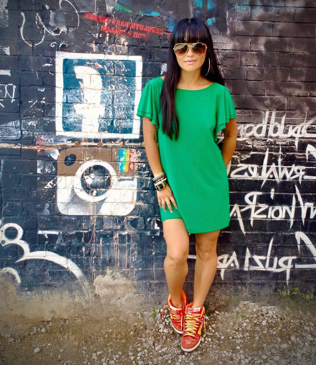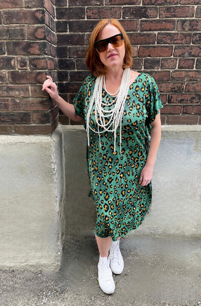 The appeal of the ANNE HUNG Collection lies in its customizable fabric options. Here, Beth selected the Kelly Green Leopard artsy print for her lounge dress.