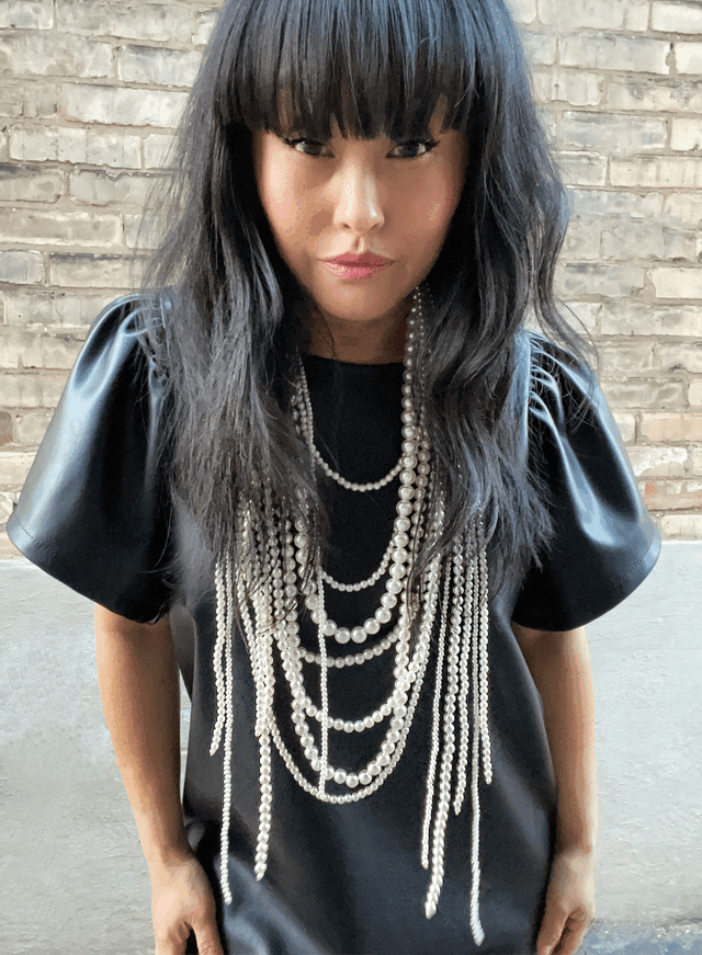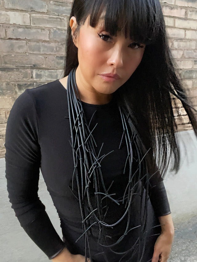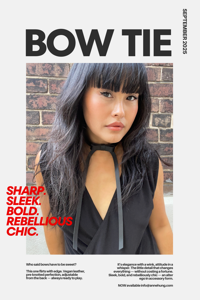 A basic accessory can alter the appearance of an attire. This vegan leather adjustable bow tie necklace is indeed playful, charming, and a sudden transformation. Arriving soon at shop.annehung.com online retail.