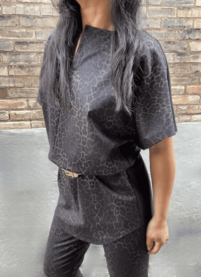 Muted leopard print baseball tunic paired with black jersey back and coordinating slim joggers with black rib cuffs.