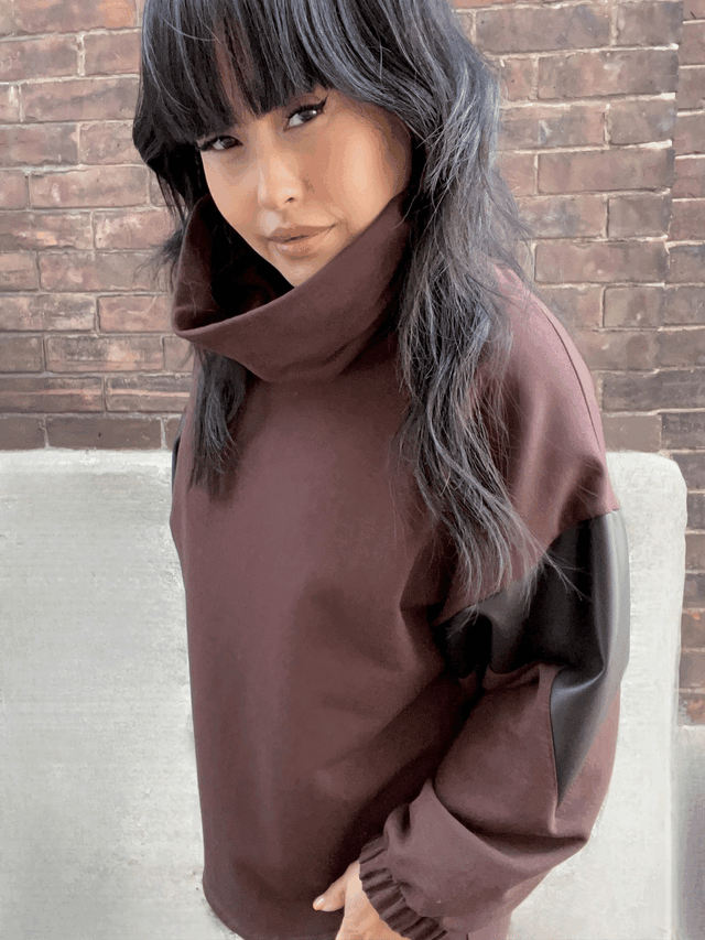 Stylish brown fleece turtleneck top featuring vegan brown leather geometric sleeve detail and a sporty hem.