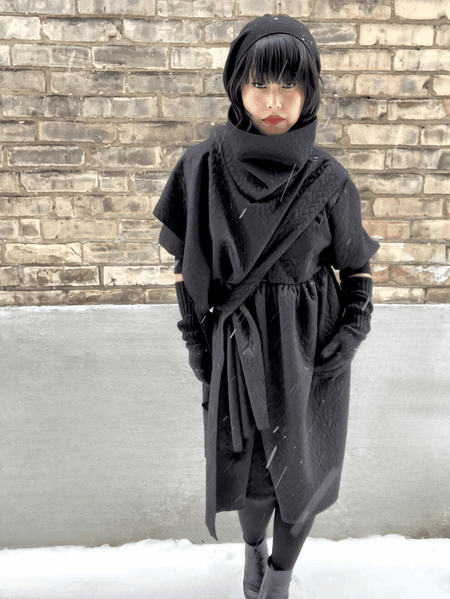 Sophisticated two-piece architectural creation inspired by Parisian couture and Japanese design. Features empire waist geometric dress and asymmetrical turtleneck shawl.
