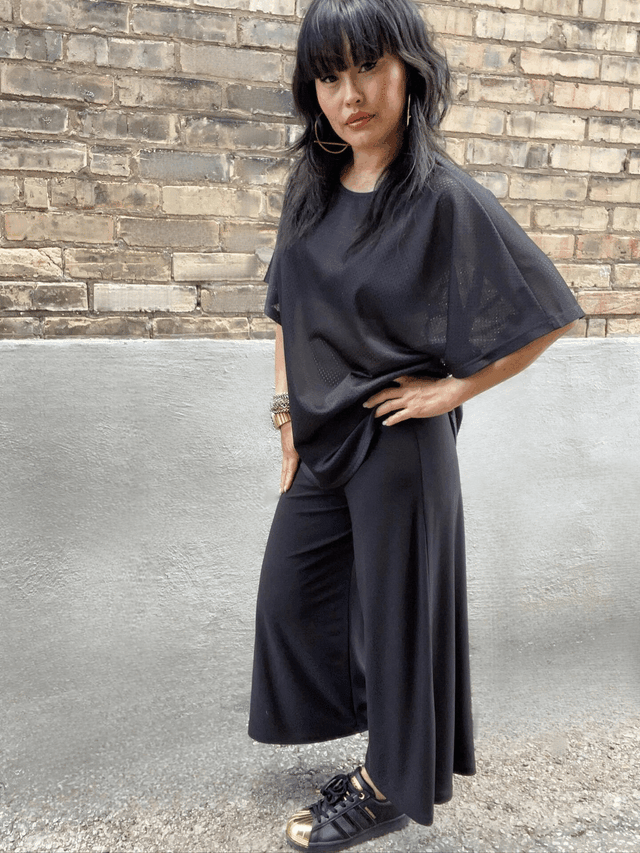 Sleek black sport mesh top with ideal black jersey palazzo pant. Quality engineering ensures this pair exceeds expectations. Versatile for both work and play.
