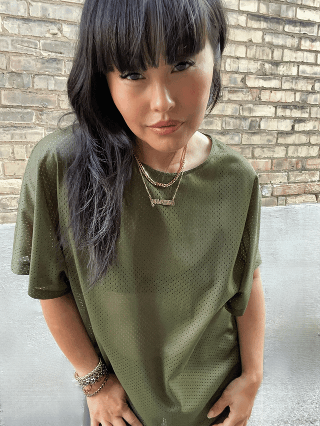 Sleek olive sport mesh top with THE PERFECT olive jersey palazzo pant.
