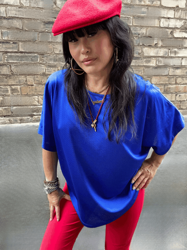 Sleek cobalt performance mesh top with a pair of vibrant red ponte fabric capri pants.